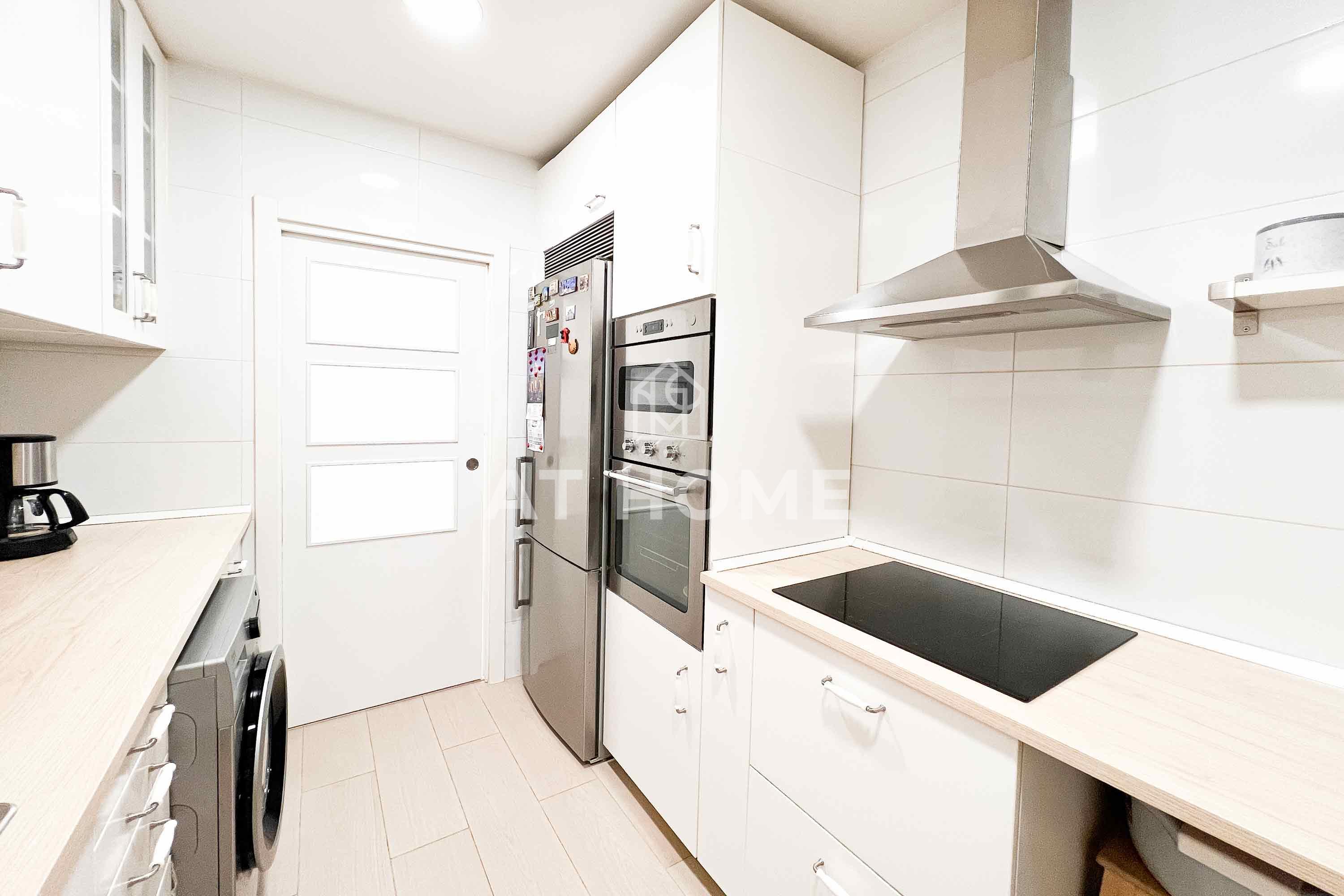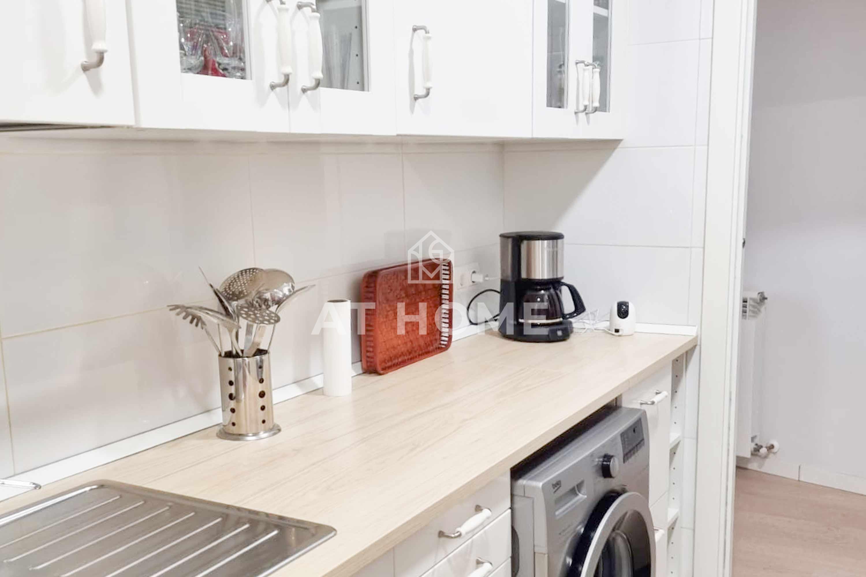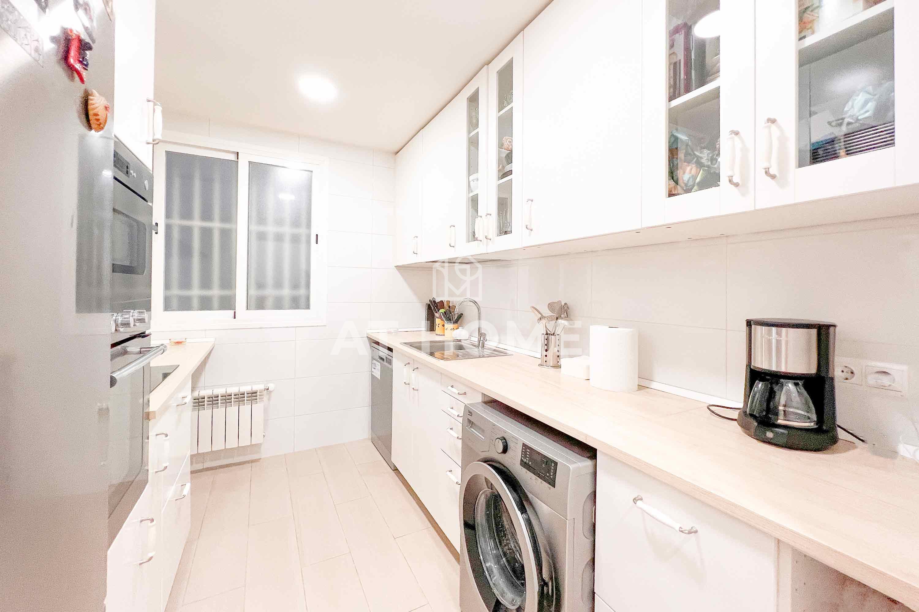 Upon entering the property, the foyer leads to a spacious room with two exterior windows facing the street, providing a sunny view towards trees and the city. The living-dining room, separated by a bookshelf, shares the two windows that overlook the street and provide plenty of light. From here, a corridor leads to a small pantry for cleaning utensils and to the kitchen, fully equipped and with an interior window.
