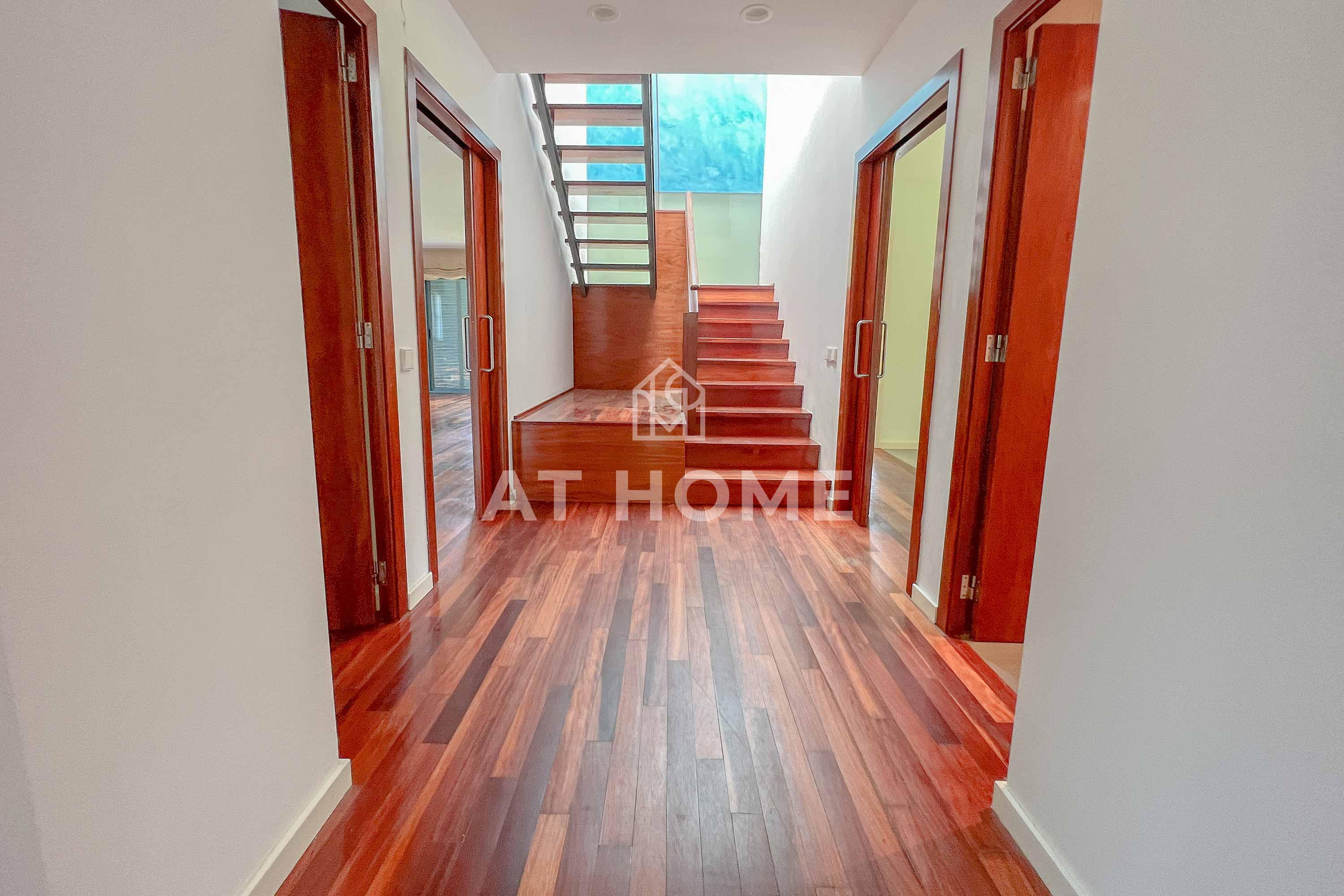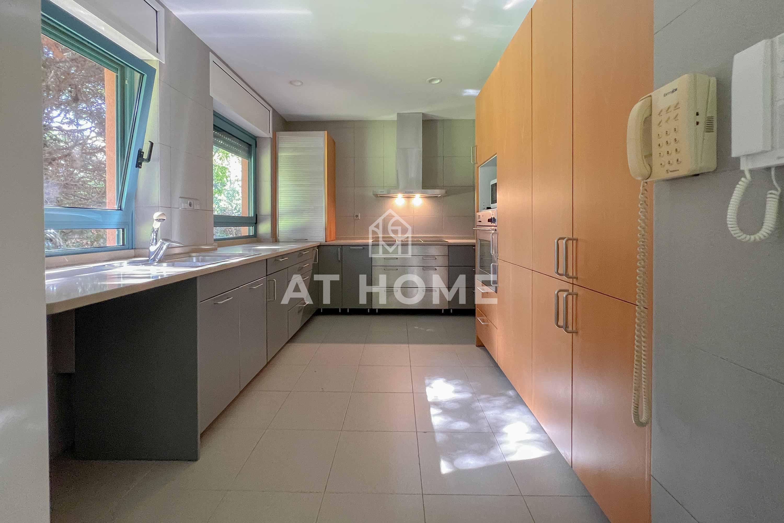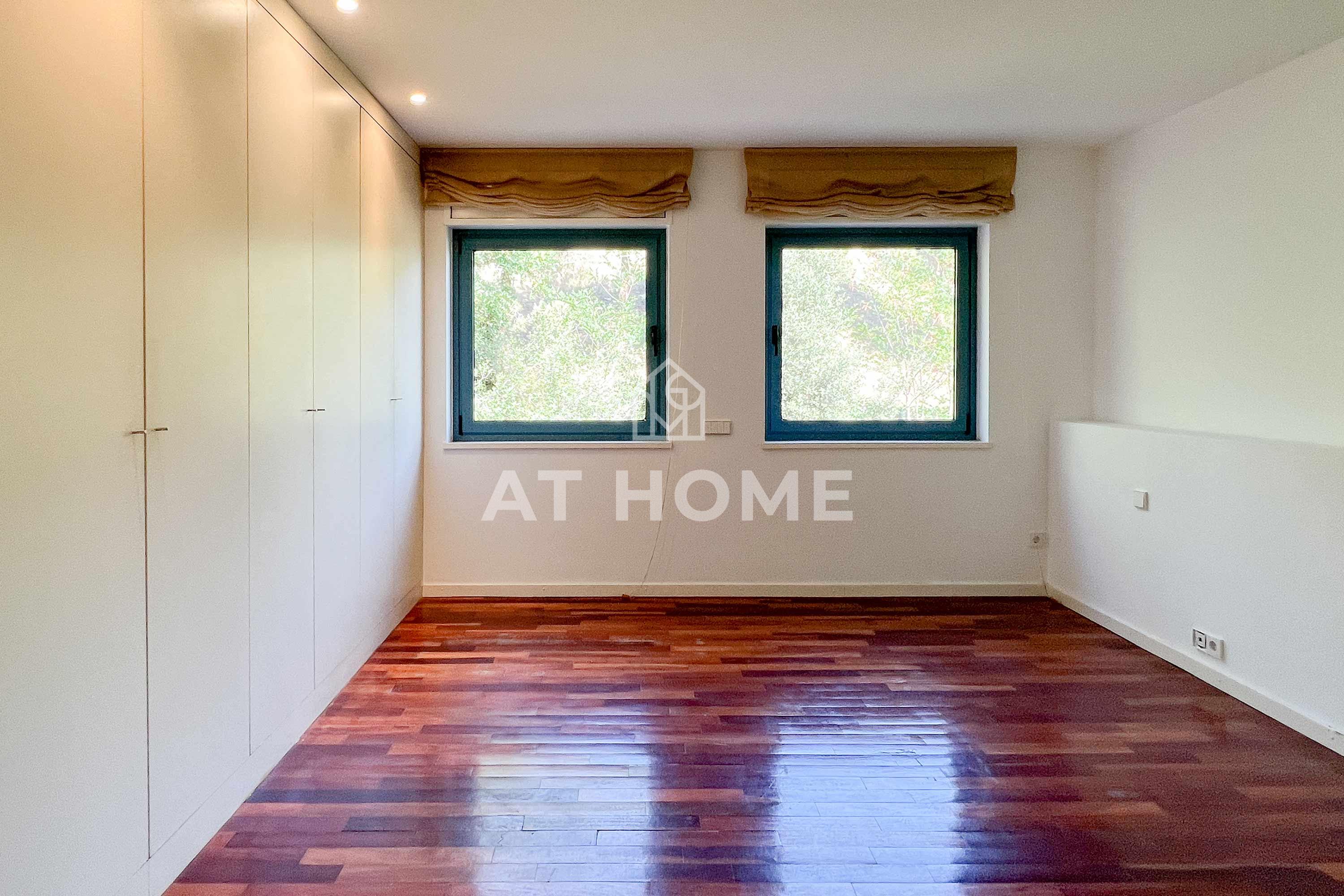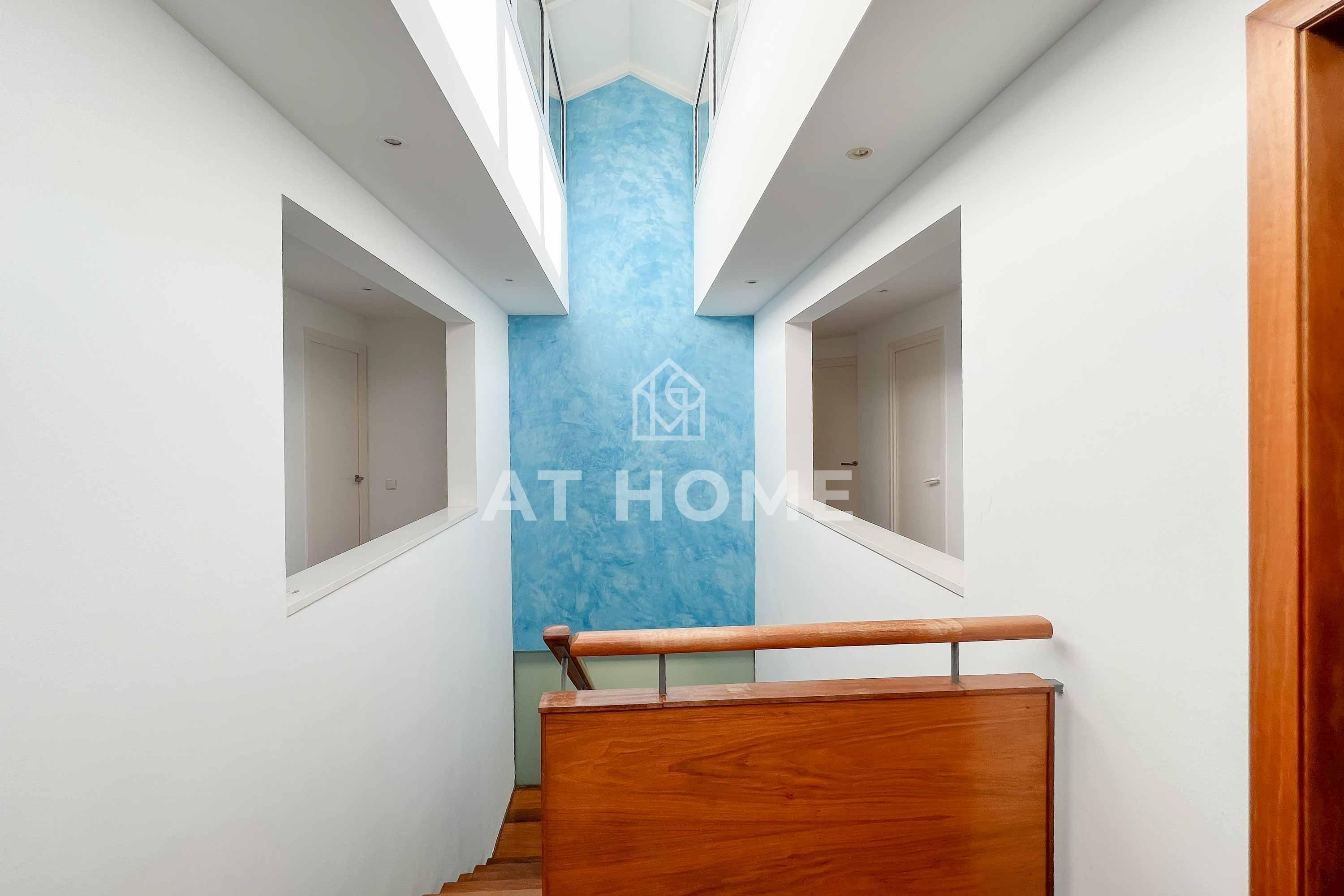 On the first floor you will find a large entrance hall with skylight that illuminates the whole house, a guest toilet, a living room-library and office connected by sliding wooden doors, an informal living room, a separate kitchen with another dining room, service area and laundry. The upper floor is a large sleeping area with a large suite with dressing room and four double bedrooms with fitted closets and bathrooms.