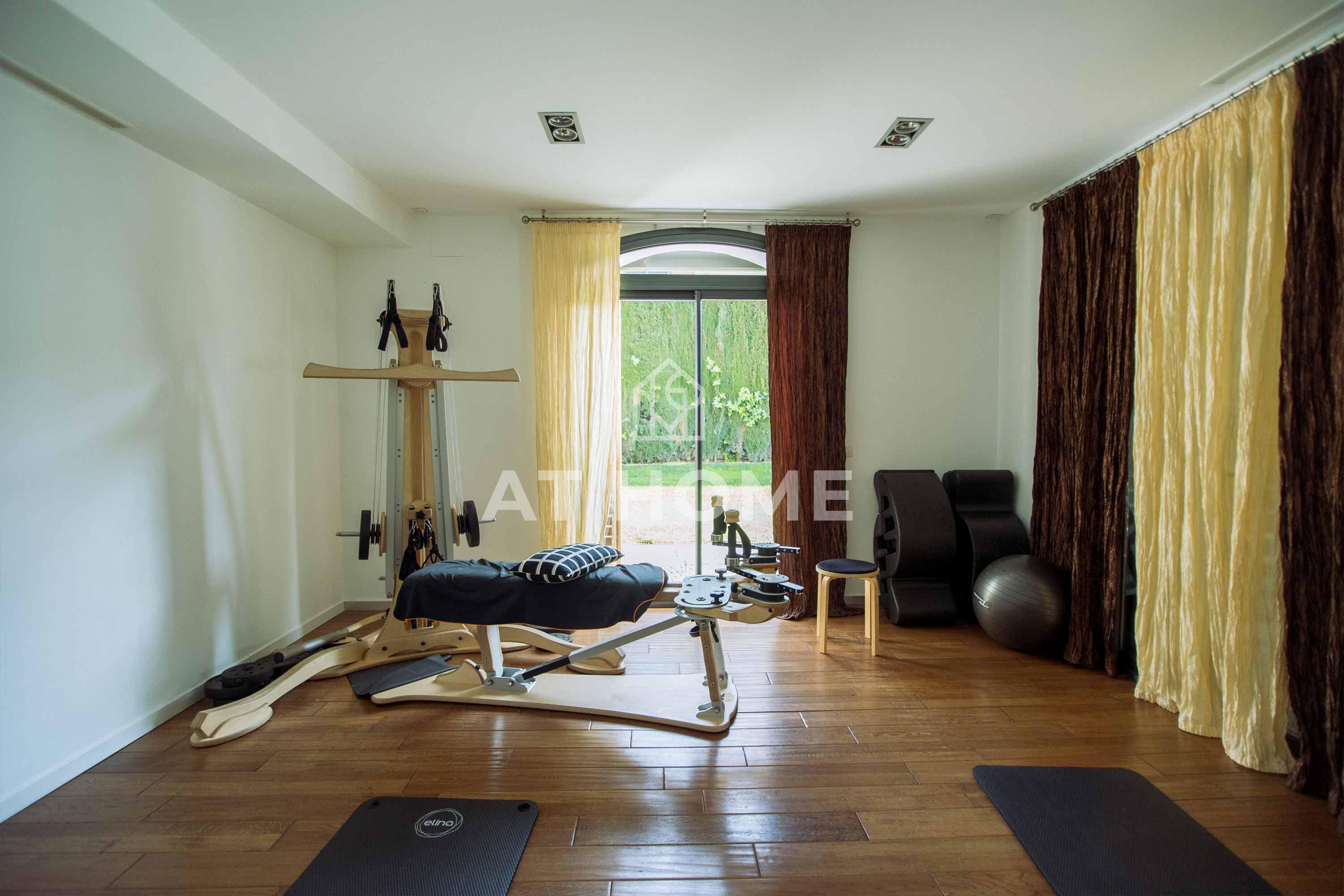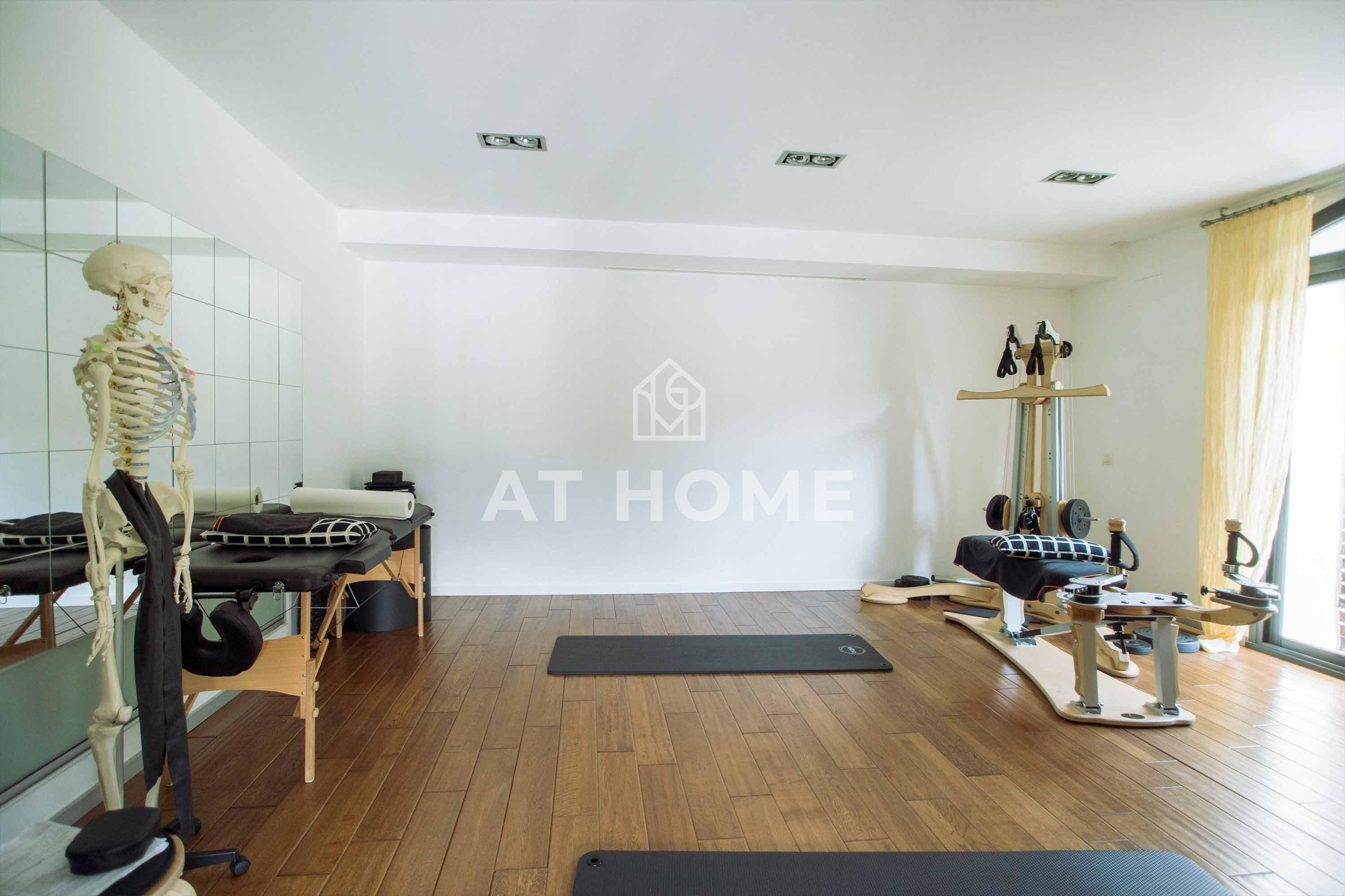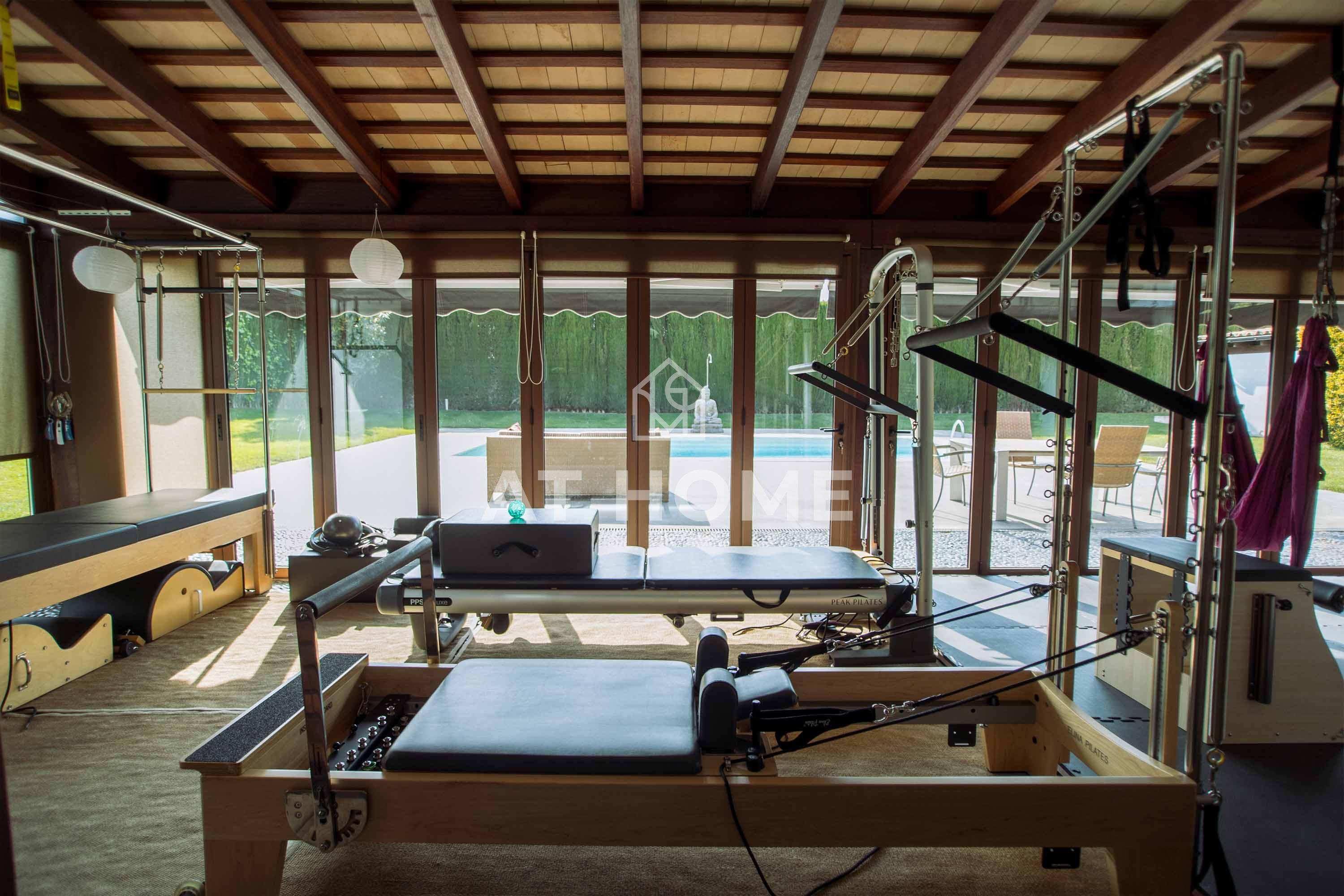 On the second floor from the large hall we access the living room, (now transformed into a pilates studio) with access to the porch and pool, at the back is the kitchen with island, and to the right of the hall there is an office, two bedrooms en suite, service area, and a toilet.