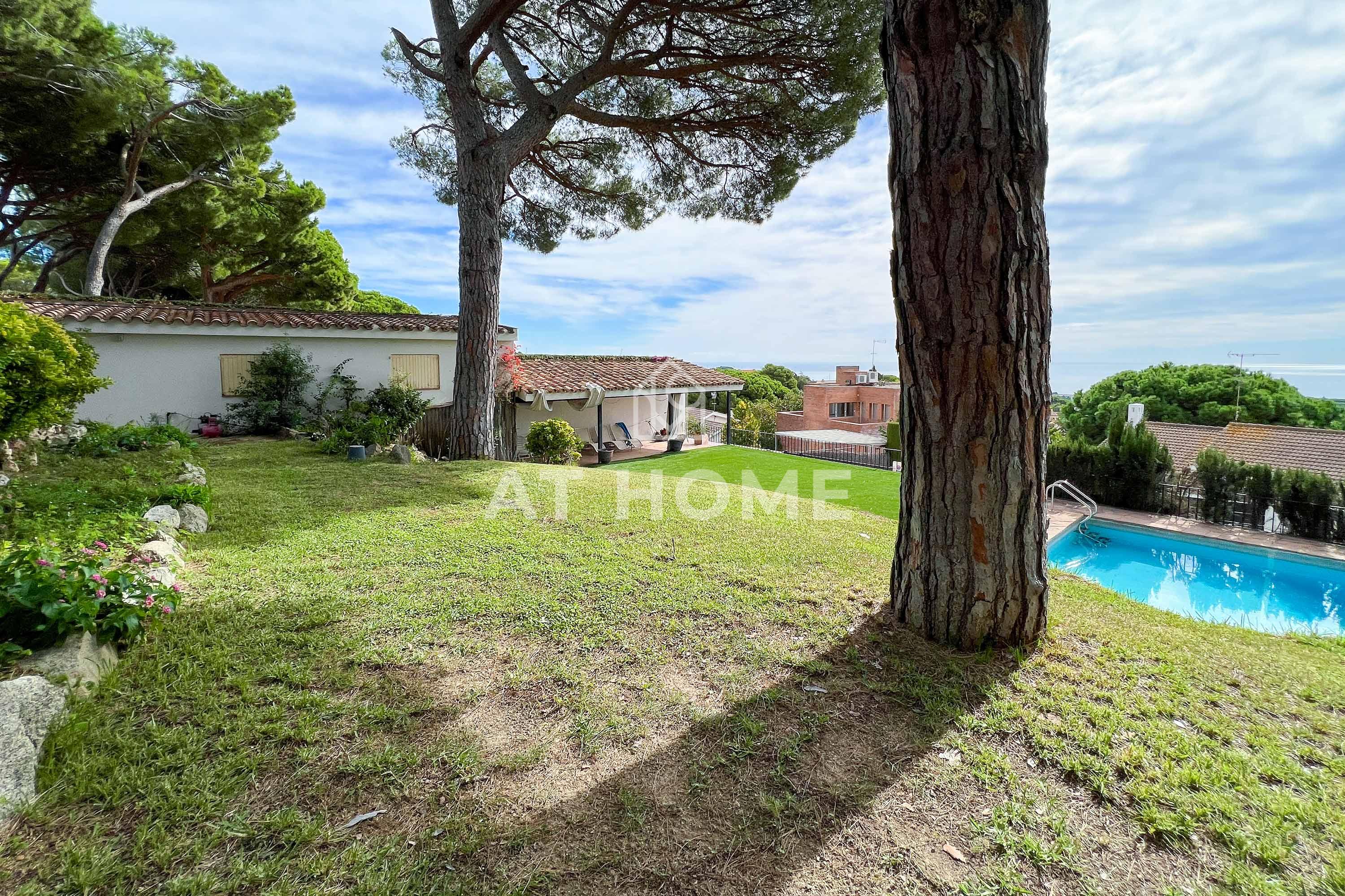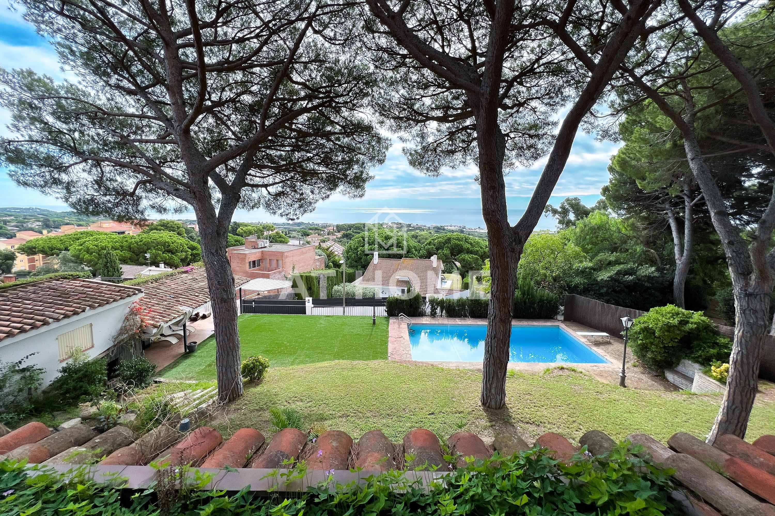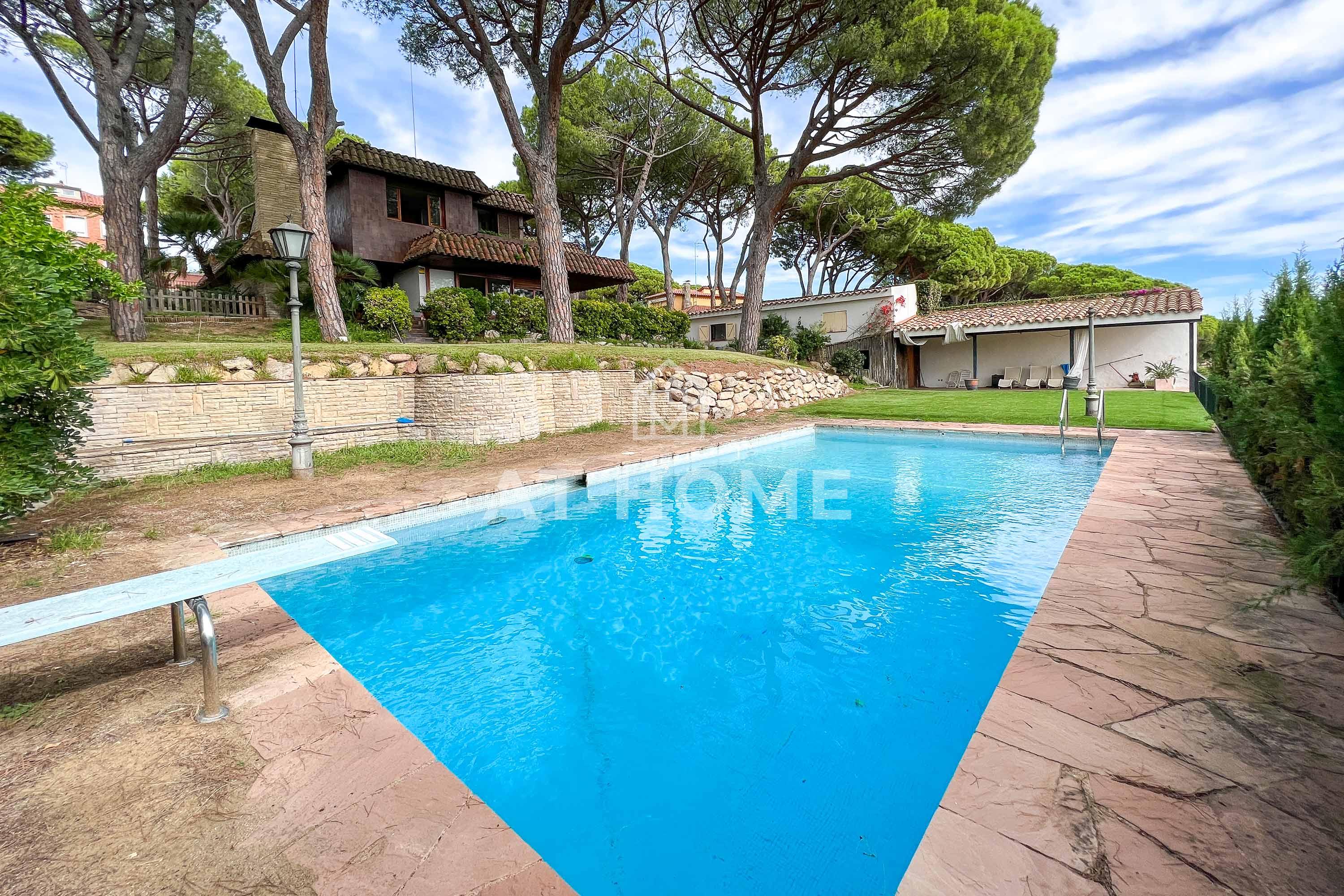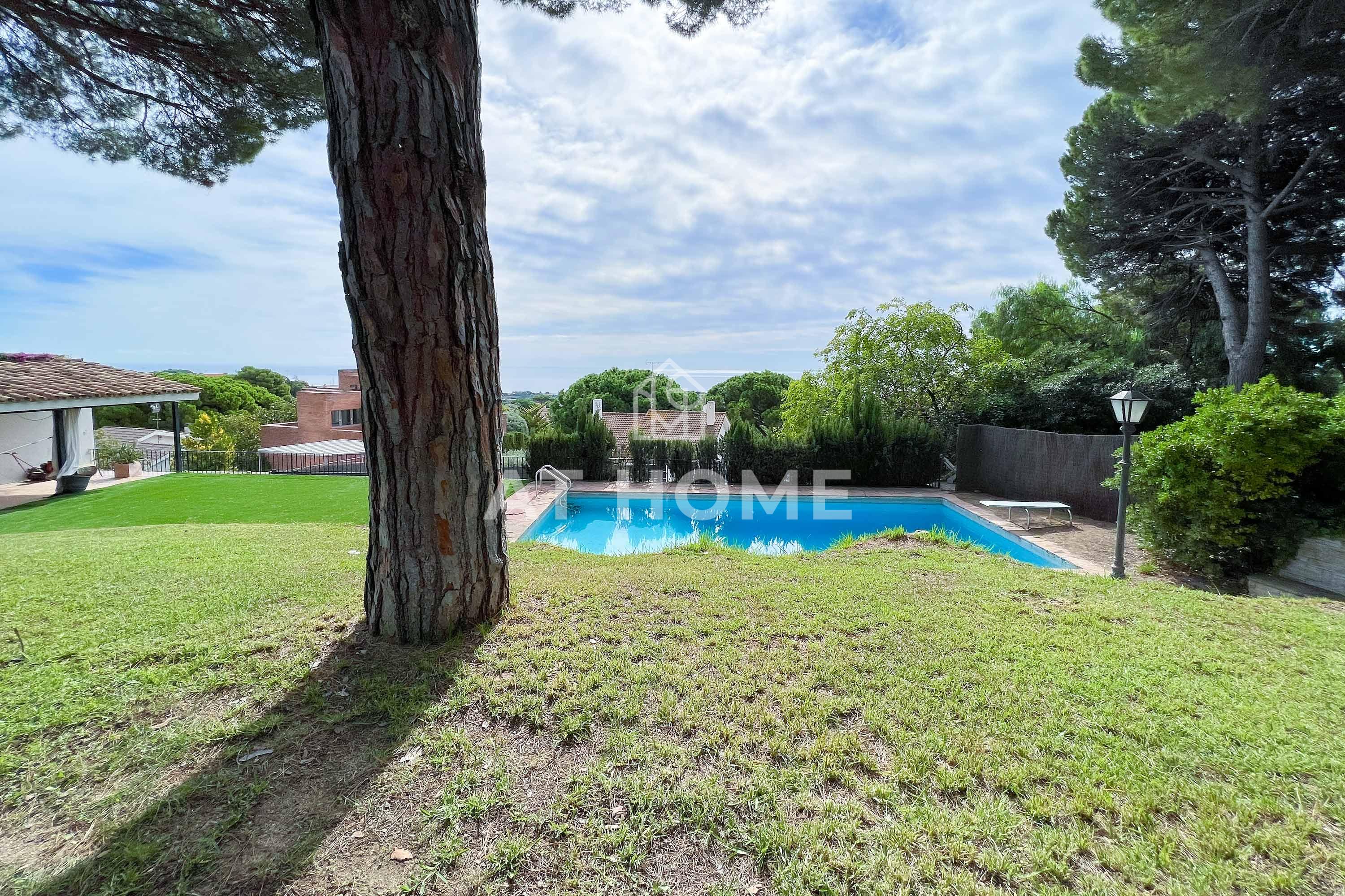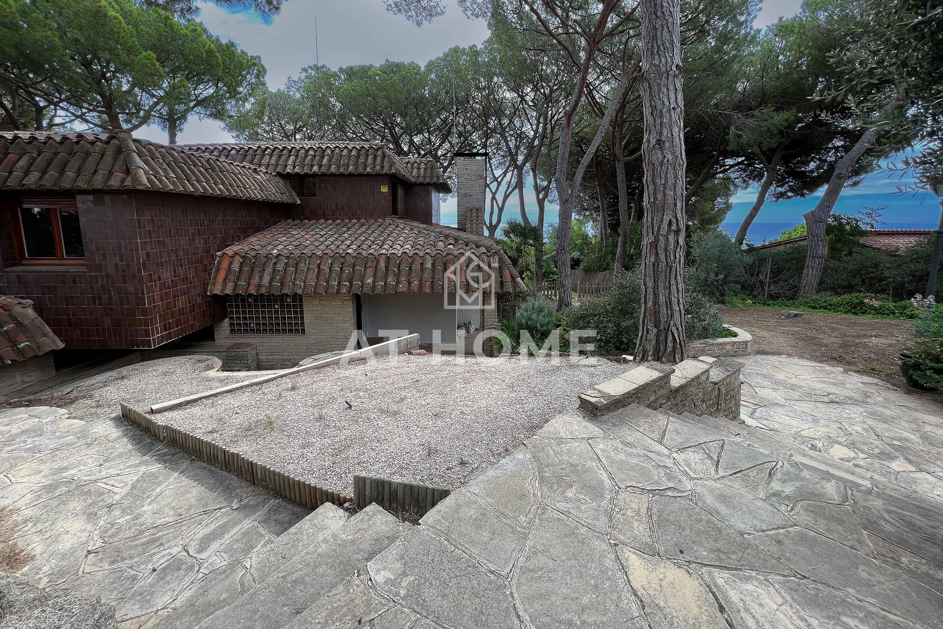 This unique house is located steps from the village of Sant Andreu de Llavaneres, with spectacular sea views surrounded by a garden and a large swimming pool. It has a small attached house plus a porch with access to the parking lot, where we find the changing rooms and a multipurpose room.