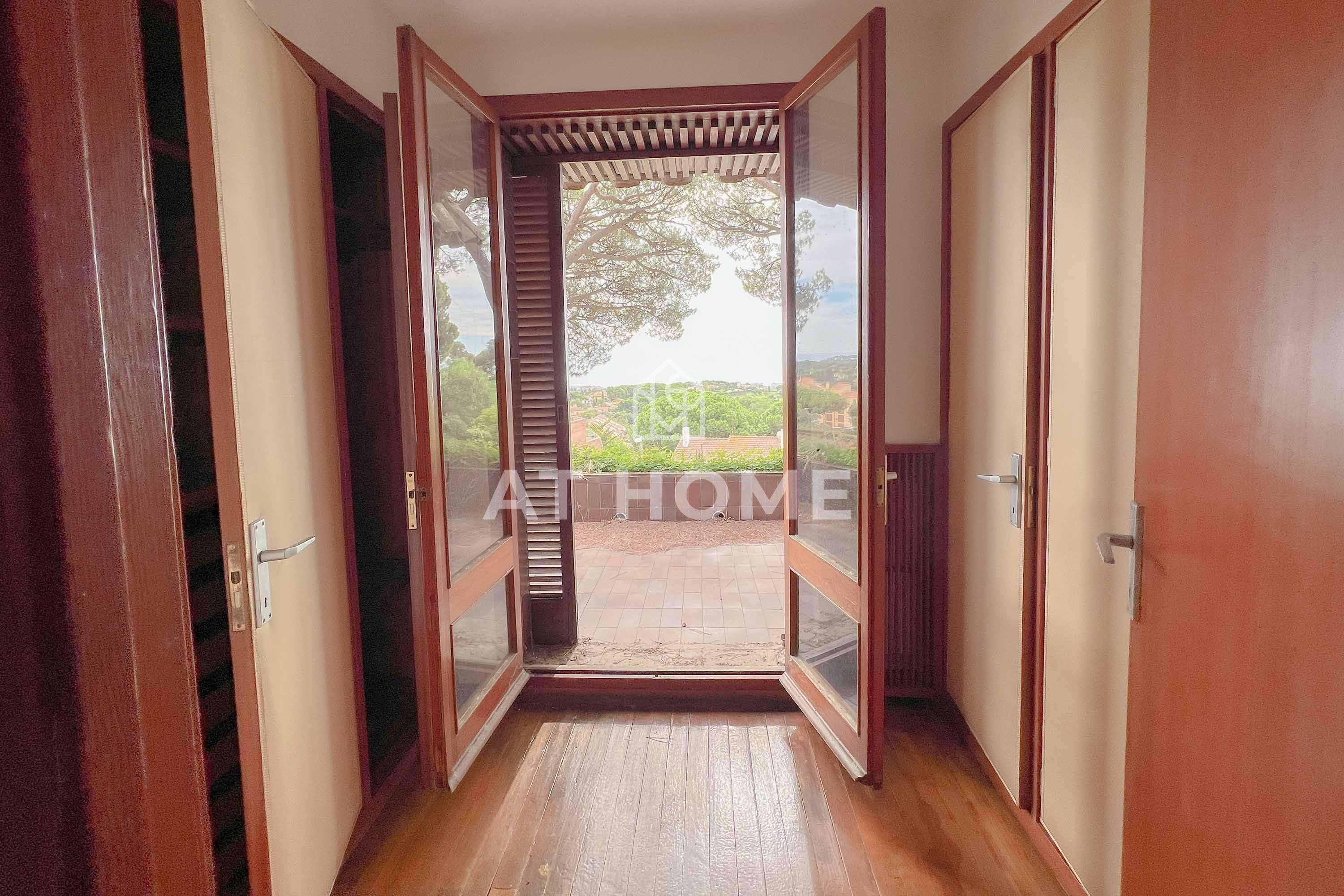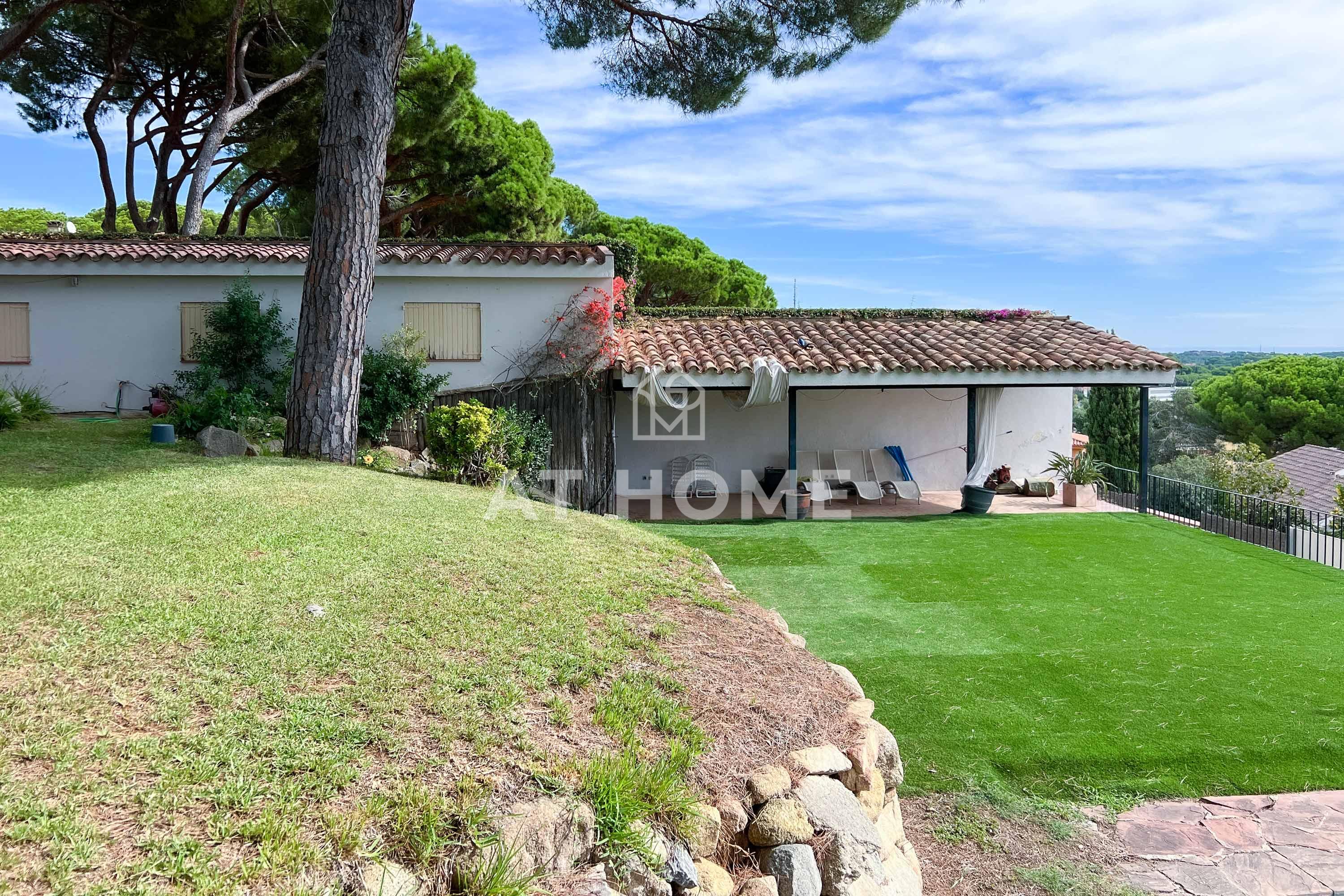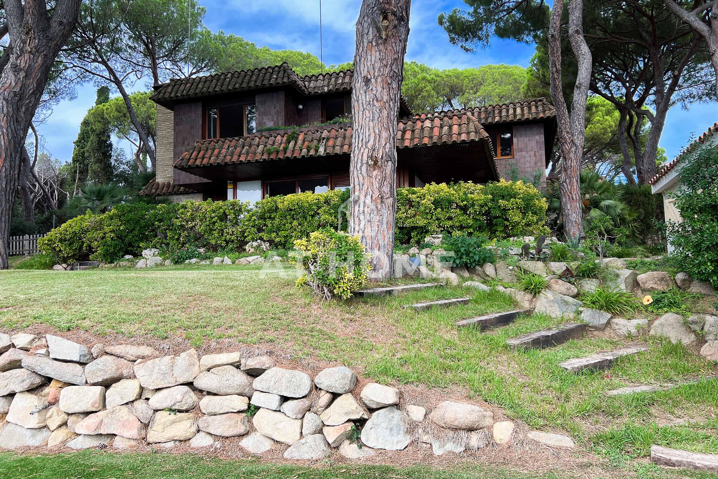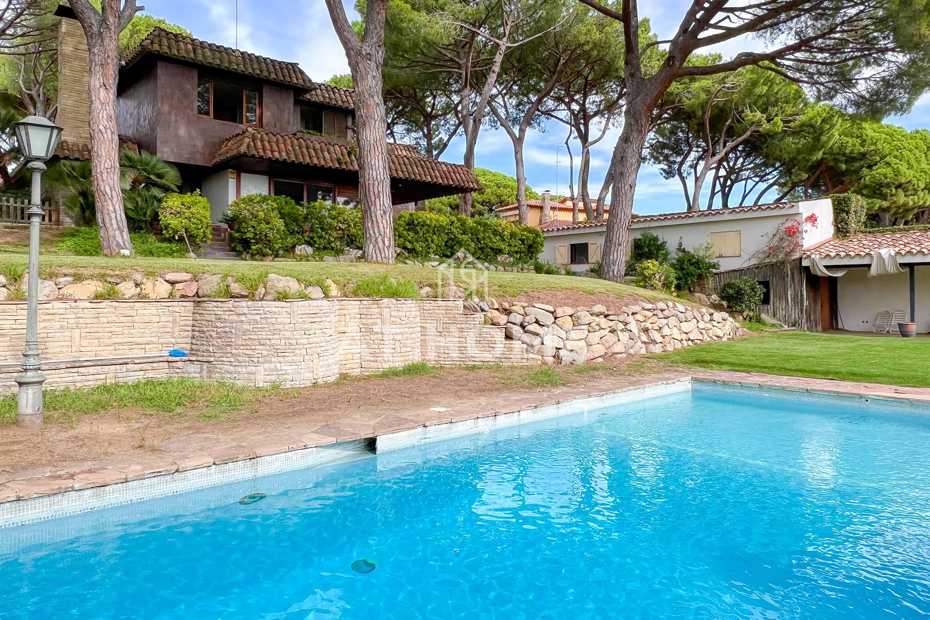 This unique house is located steps from the village of Sant Andreu de Llavaneres, with spectacular sea views surrounded by a garden and a large swimming pool. It has a small attached house plus a porch with access to the parking lot, where we find the changing rooms and a multipurpose room.