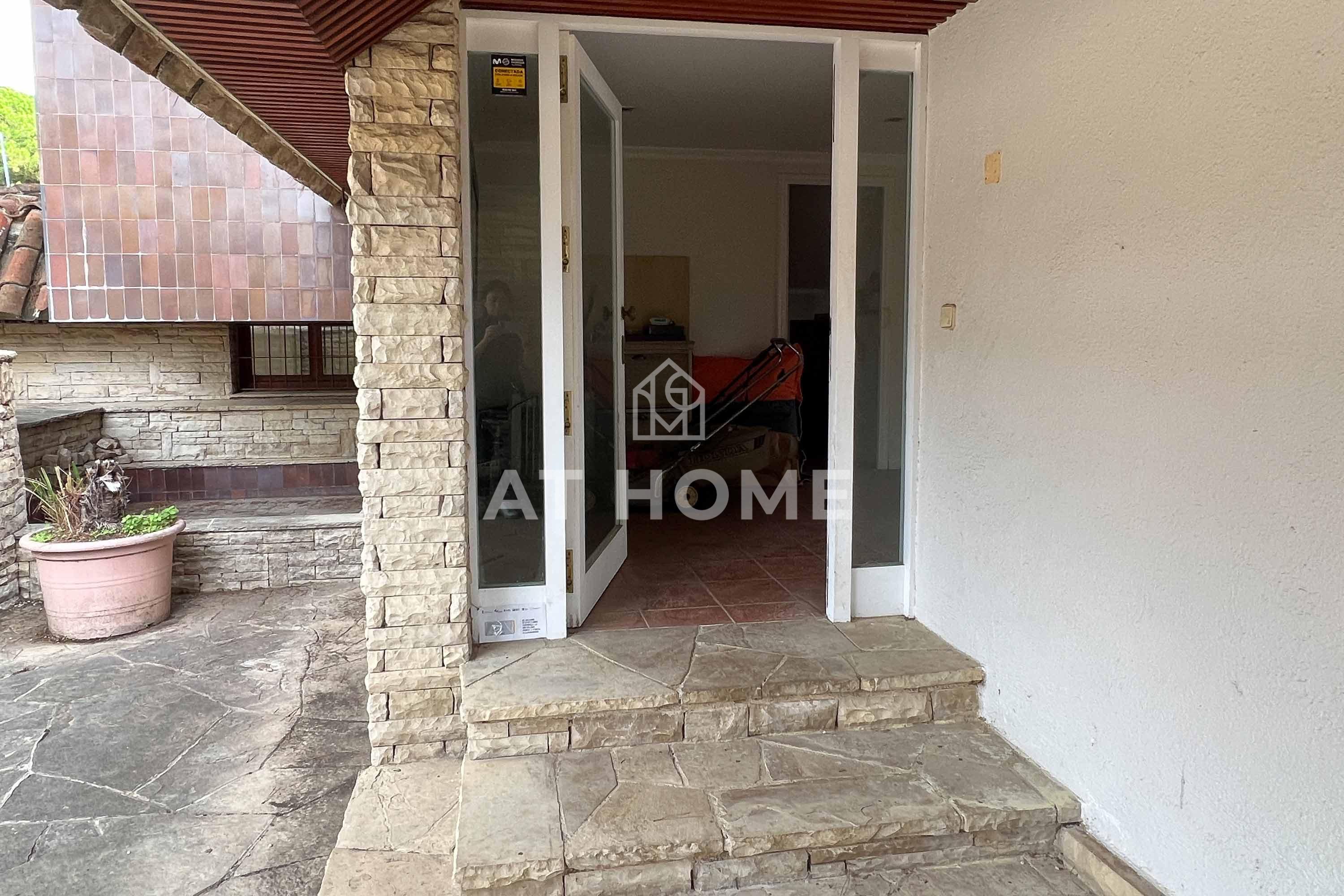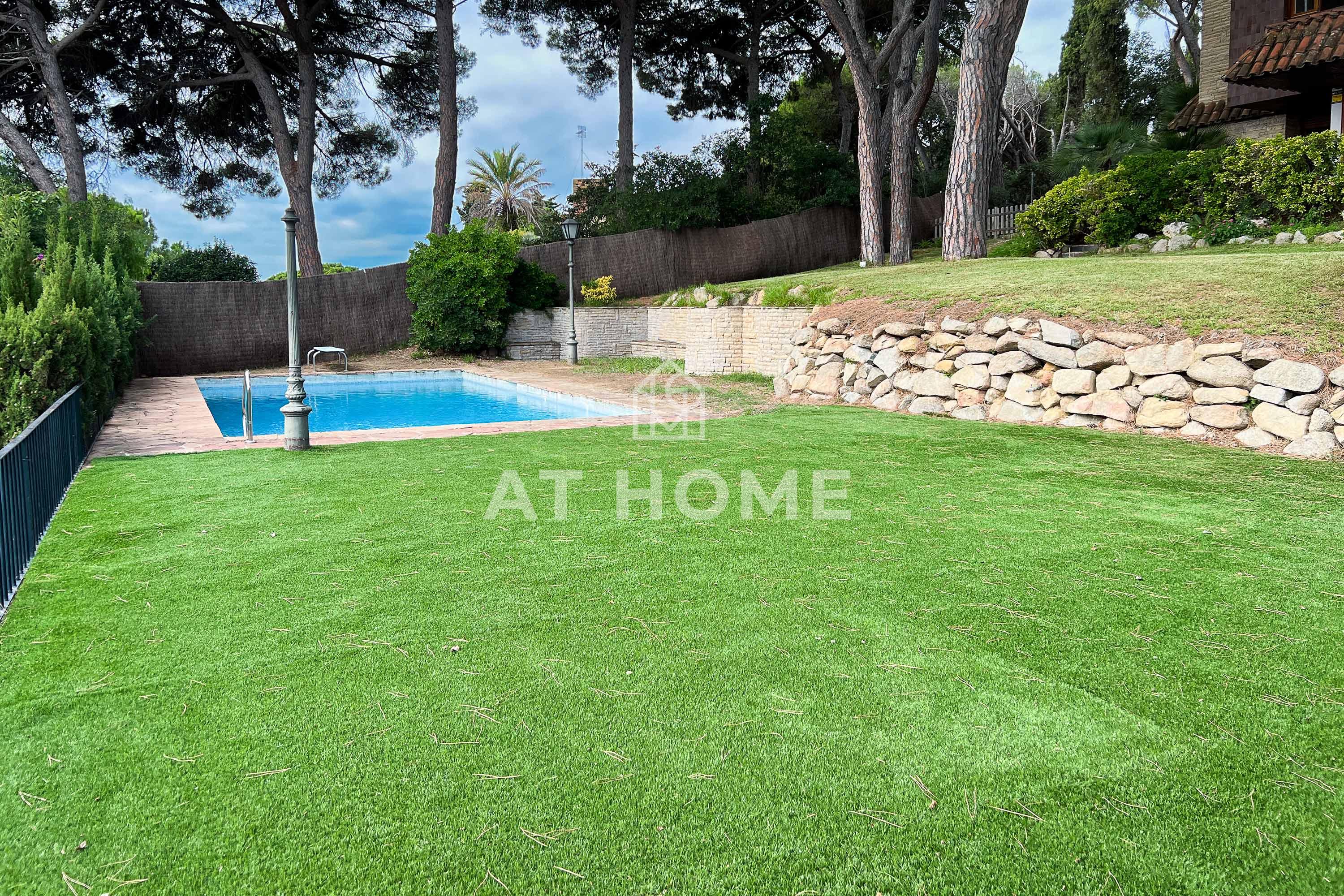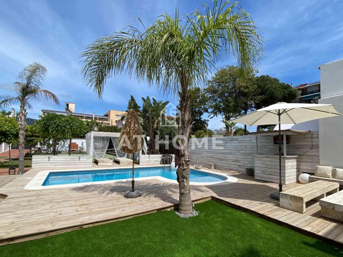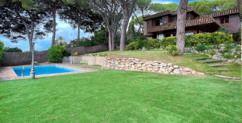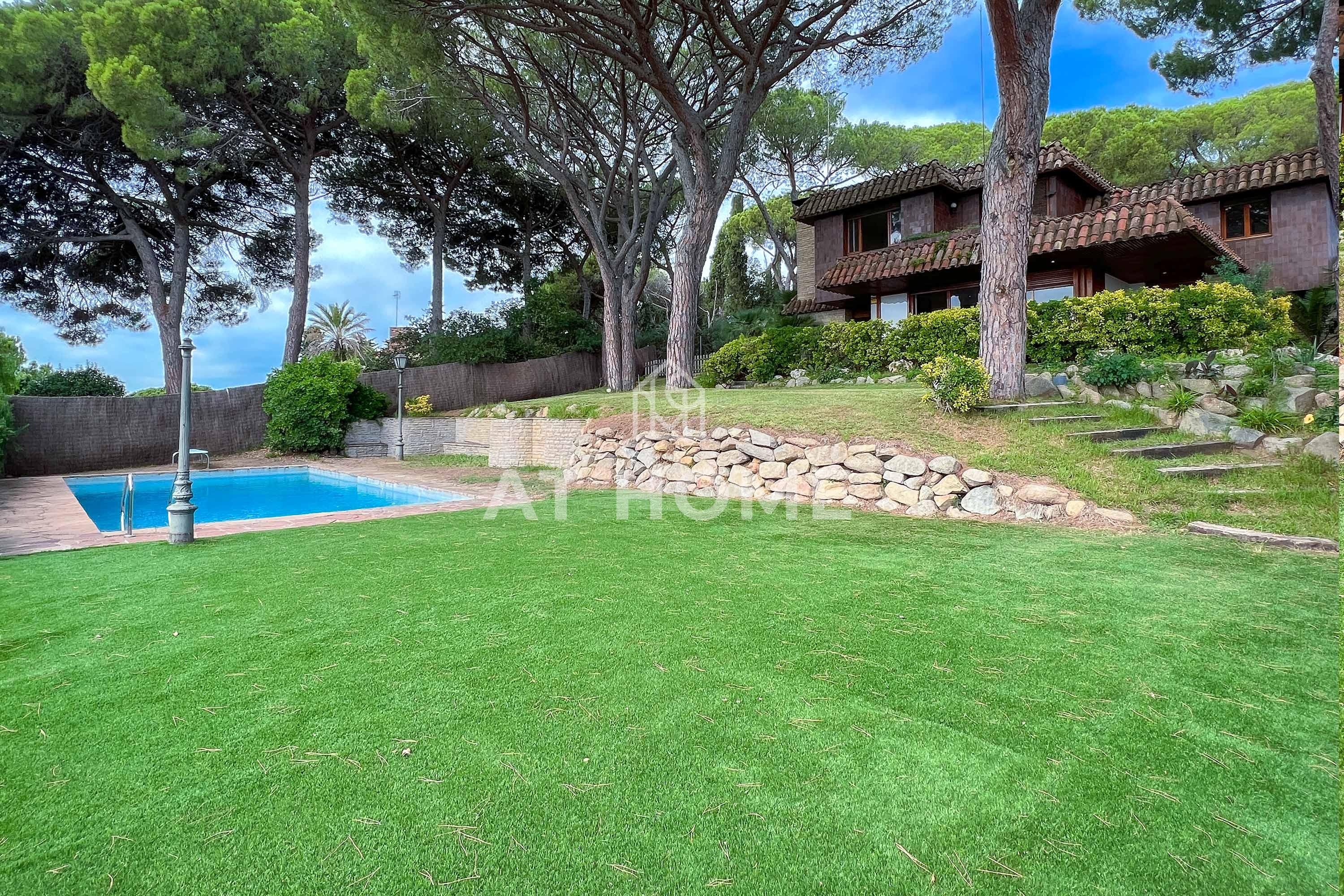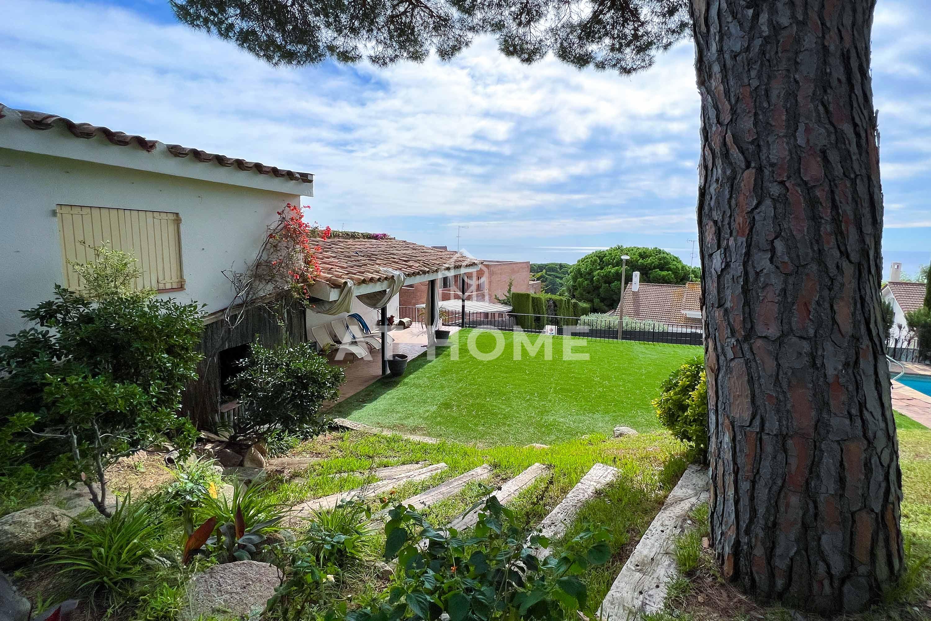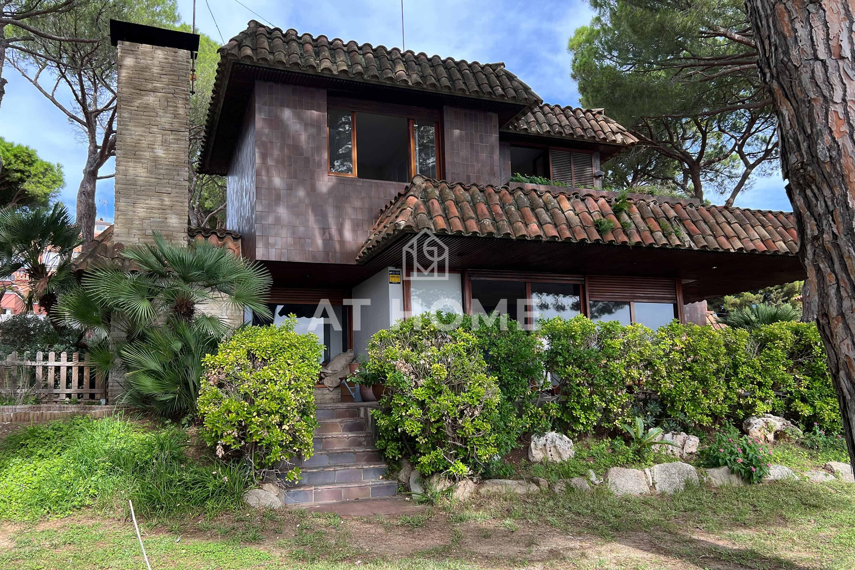 This unique house is located steps from the village of Sant Andreu de Llavaneres, with spectacular sea views surrounded by a garden and a large swimming pool. It has a small attached house plus a porch with access to the parking lot, where we find the changing rooms and a multipurpose room.