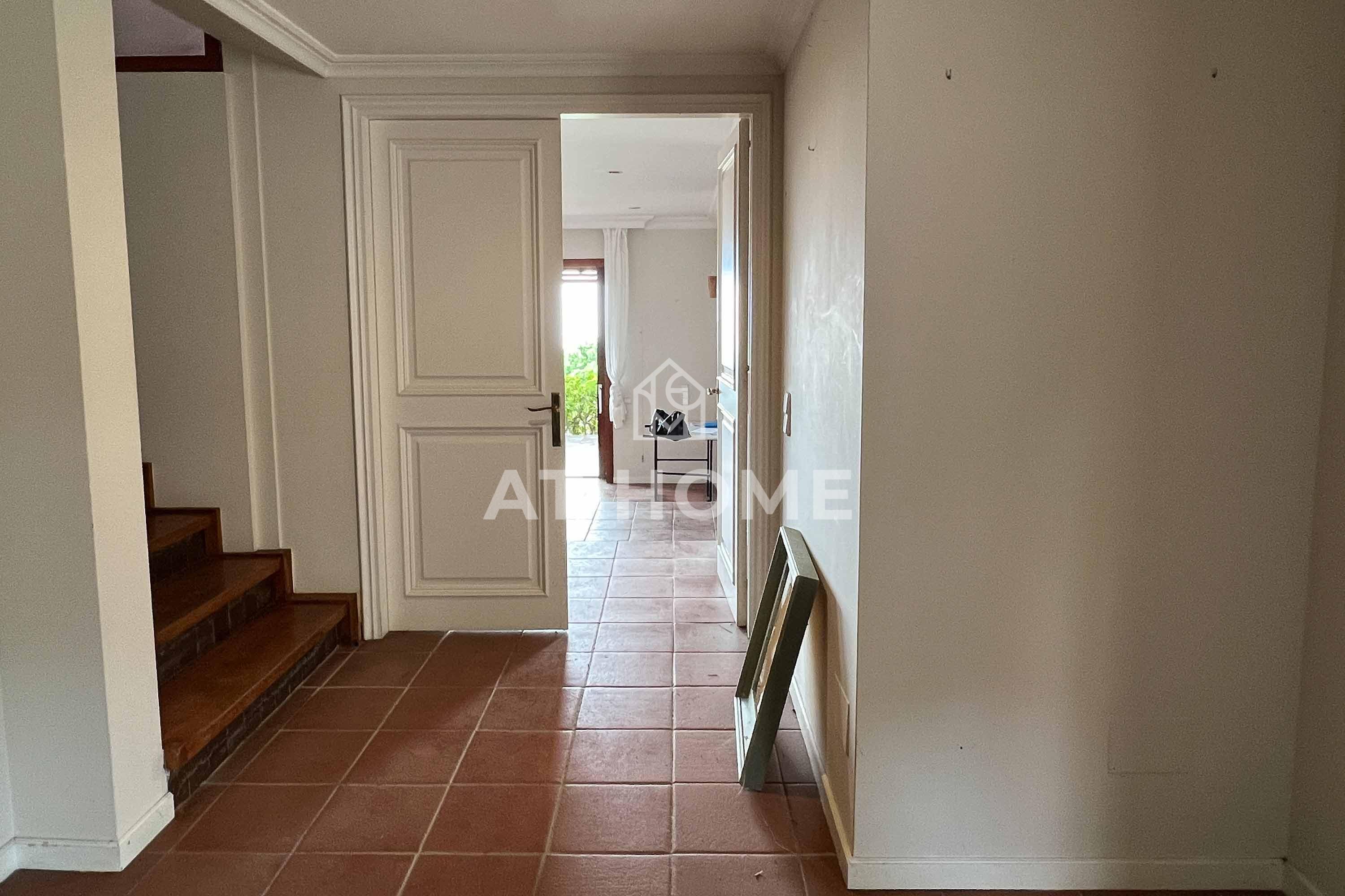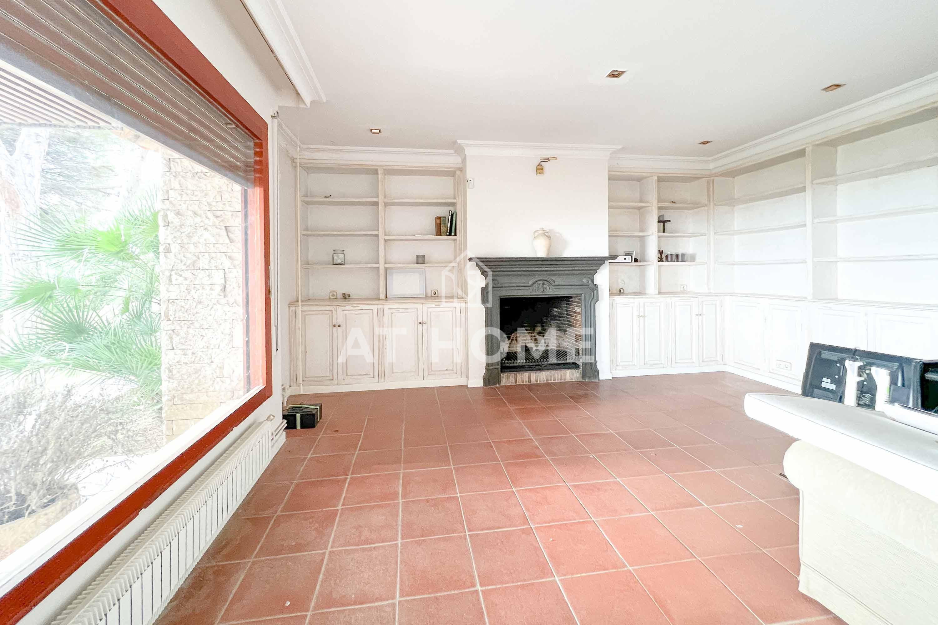 The main house is two-story, and has different levels and volumes. We access a hall, which leads to a large double living room on two levels, with fireplace and direct access to the large porch, kitchen, and service area.