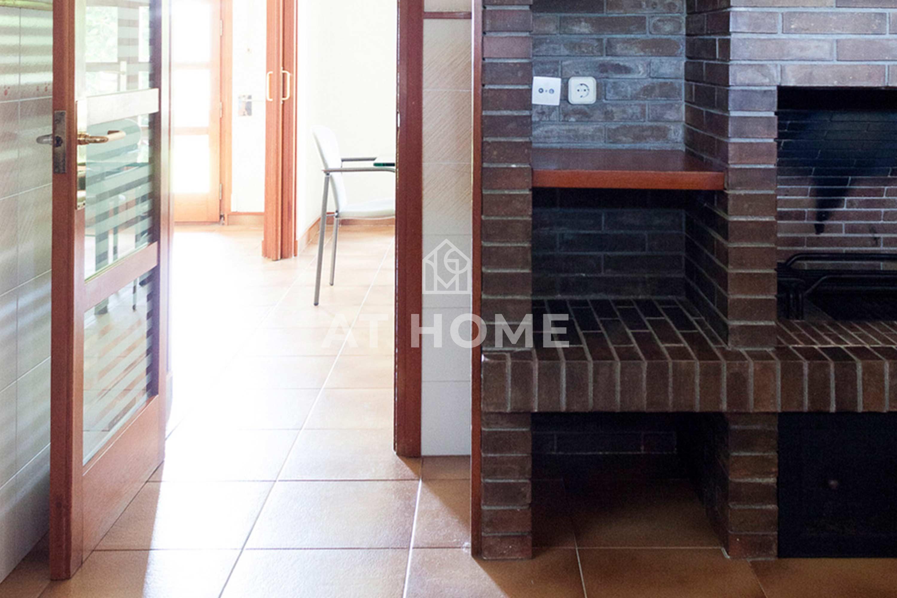 In front and to the right we find the living room and dining room with large windows overlooking the garden with direct access to the porch that runs through the house and garden. From the dining room we access to the large kitchen with utility room, which has a fantastic fireplace to enjoy on winter days, or simply cook with wood. Next to it we also find the laundry room.