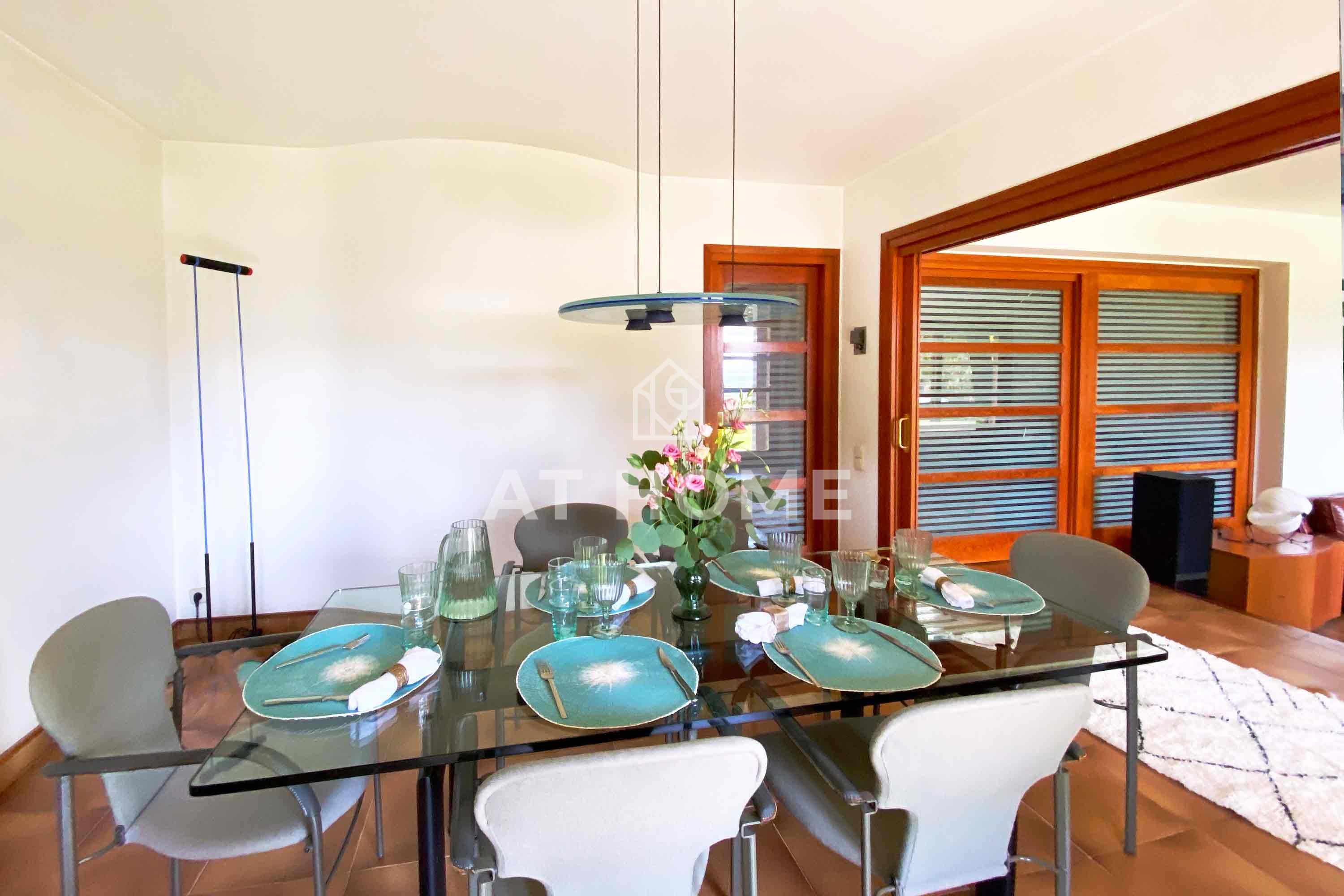To the left of the fountain hall and main entrance, we find a bathroom with shower, a large living room with direct access to a porch with barbecue and access to the large saltwater pool. This space could be an additional bedroom if desired. South facing, surrounded by lawns and large green areas. From this living room, we have access to a large gym, with wooden floors, lots of light, and peculiar construction, a space without a doubt with many possibilities.