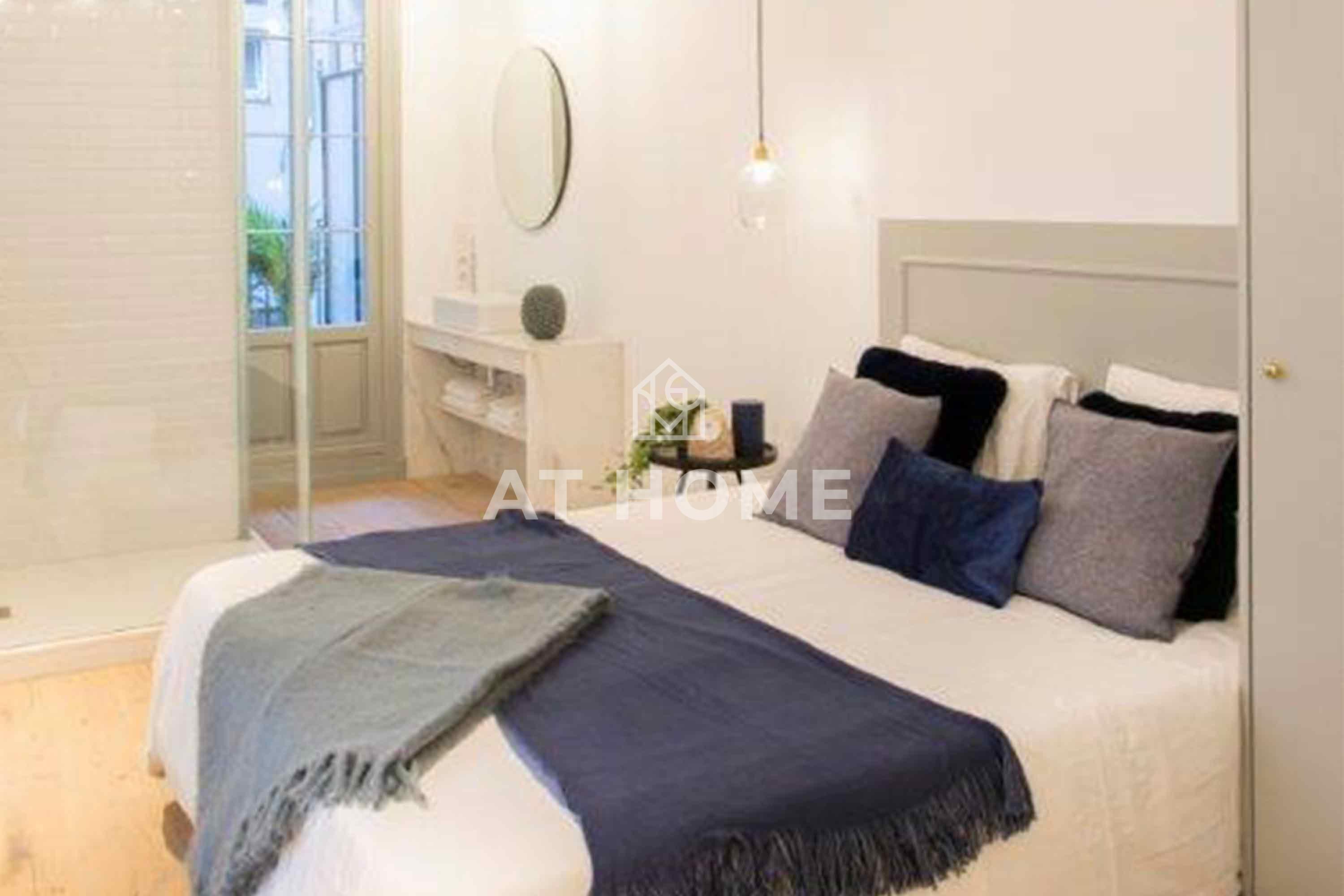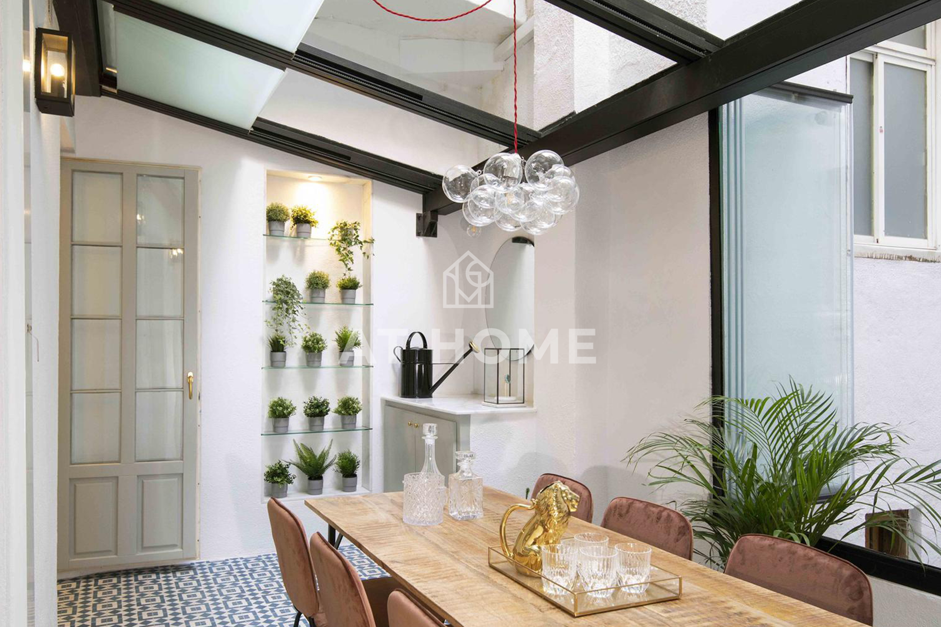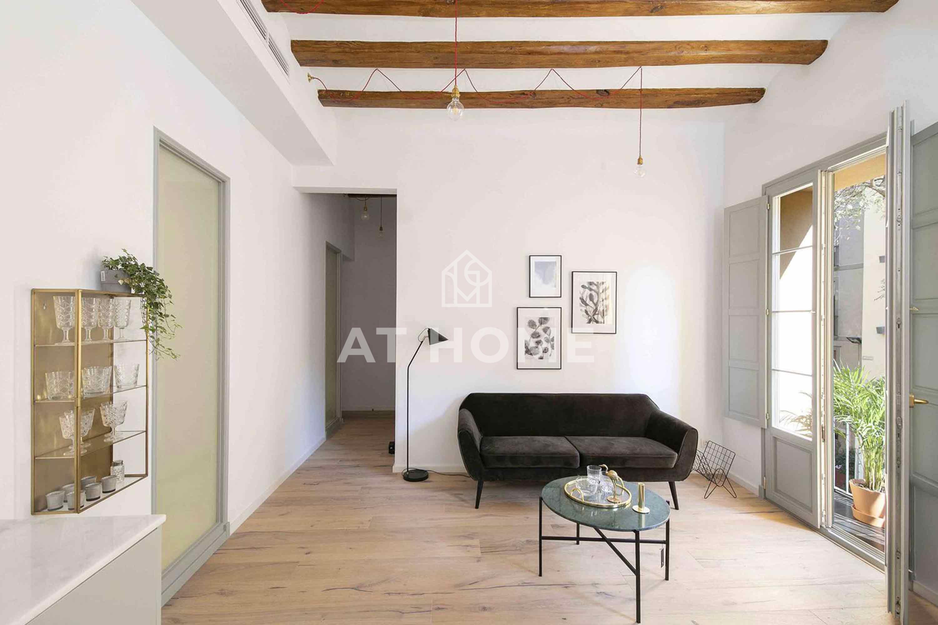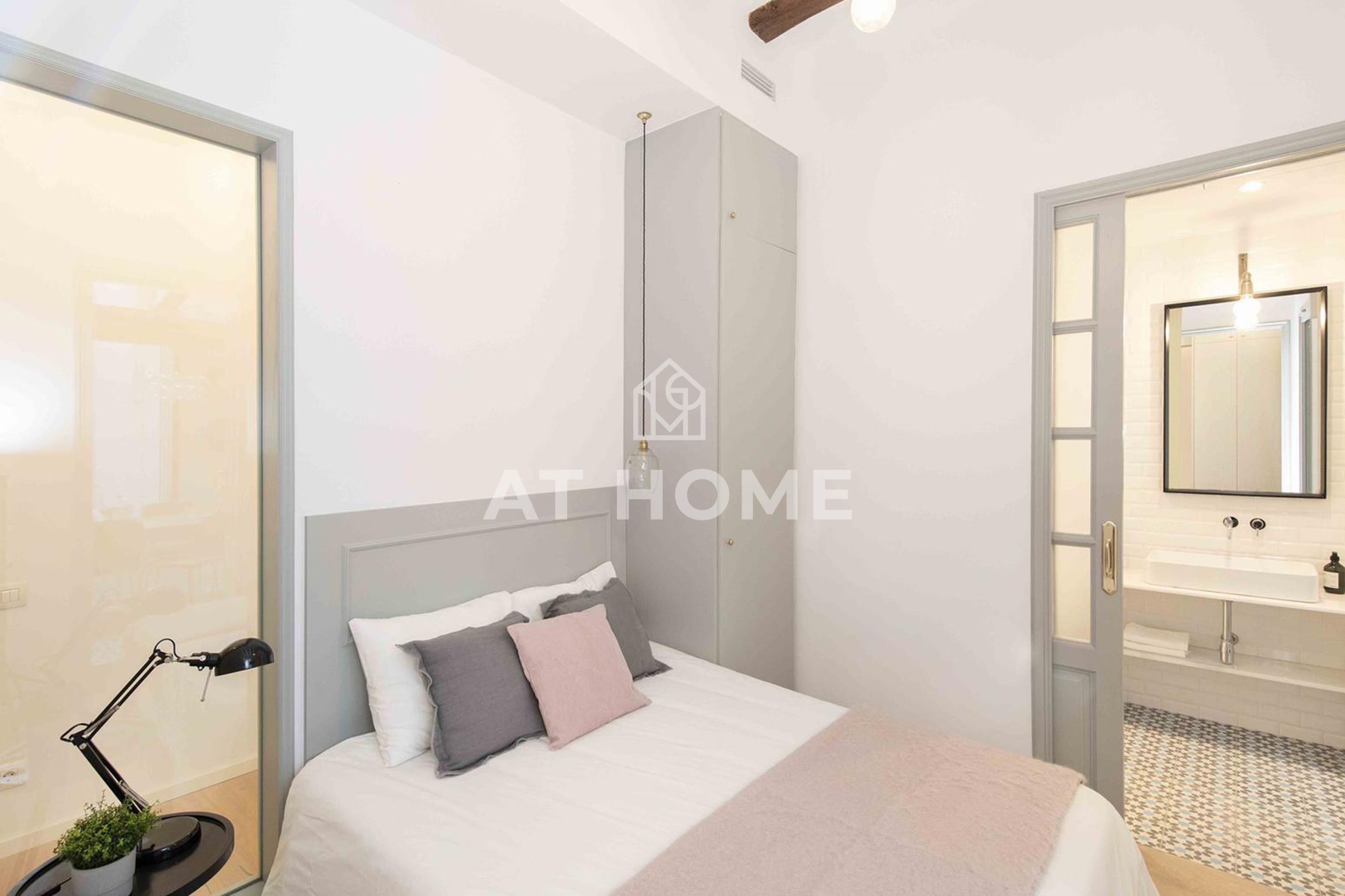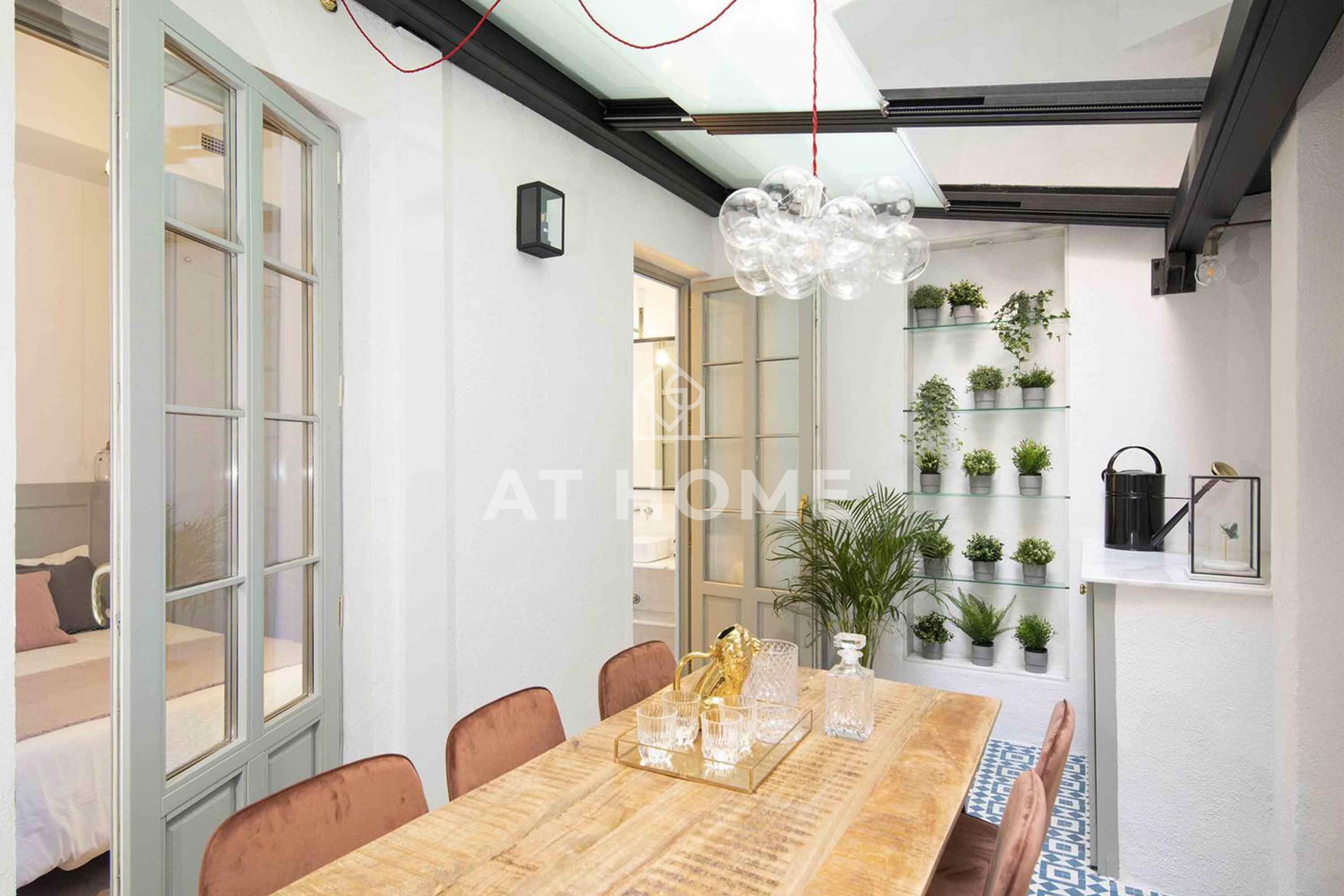 Beautiful flat, refurbished in the heart of the Borne, furnished and ready to move in, with a spectacular patio with automatic mobile roof, to enjoy in winter or summer as a terrace. Located on the first floor, it is refurbished with premium finishes and the kitchen is fully equipped. The kitchen is open to the spacious living room and gives luminosity to the whole room, with two bedrooms en suite with complete bathroom. It is an ideal flat to share, and enjoy life in Barcelona, next to Parc de la Ciutadella, Santa Maria, and all its cultural and gastronomic offer.