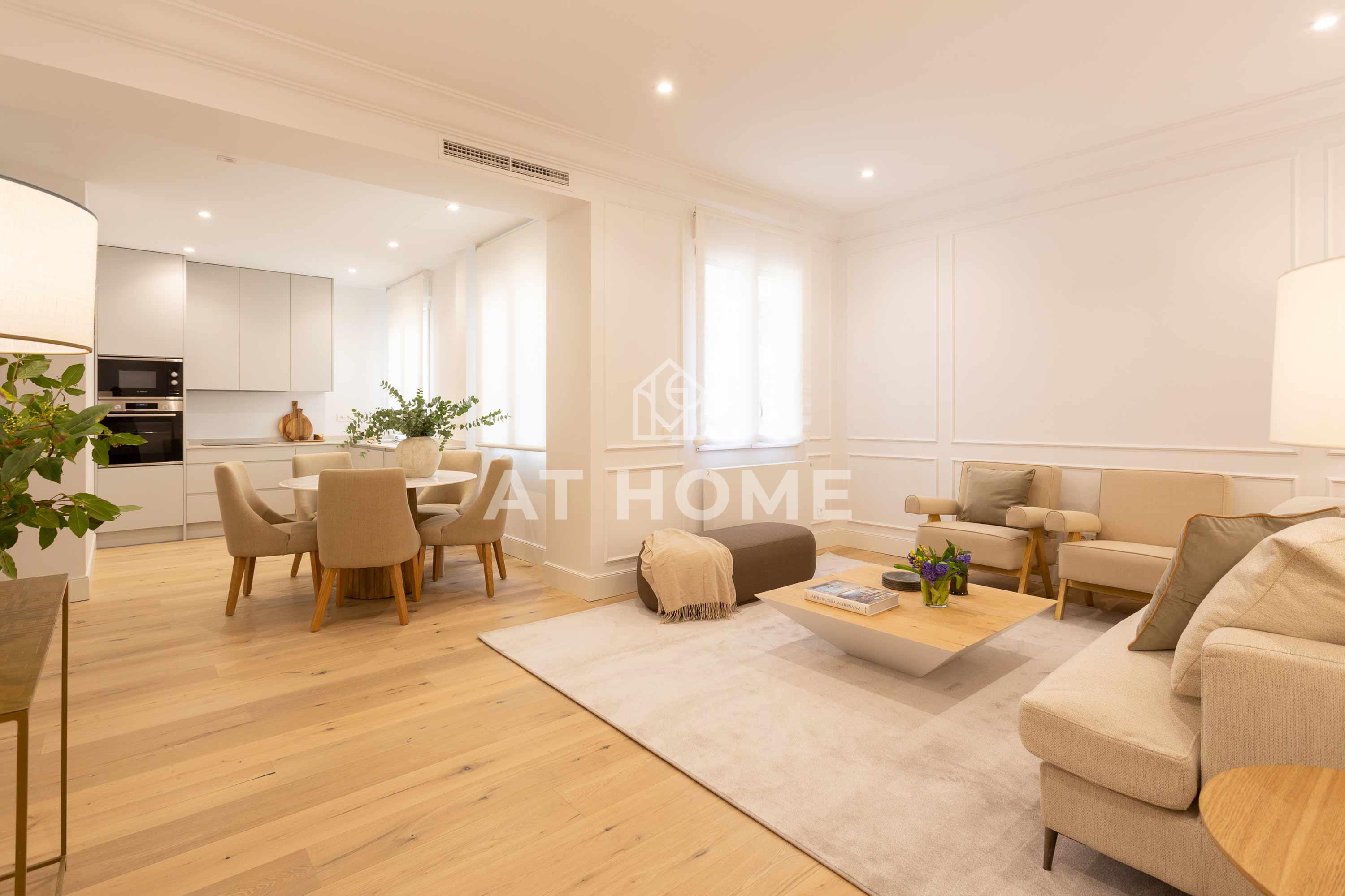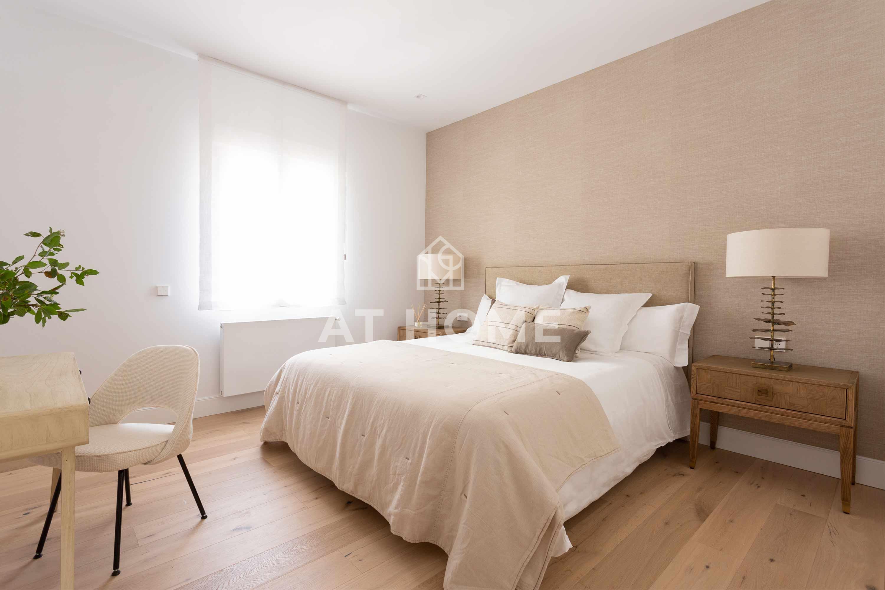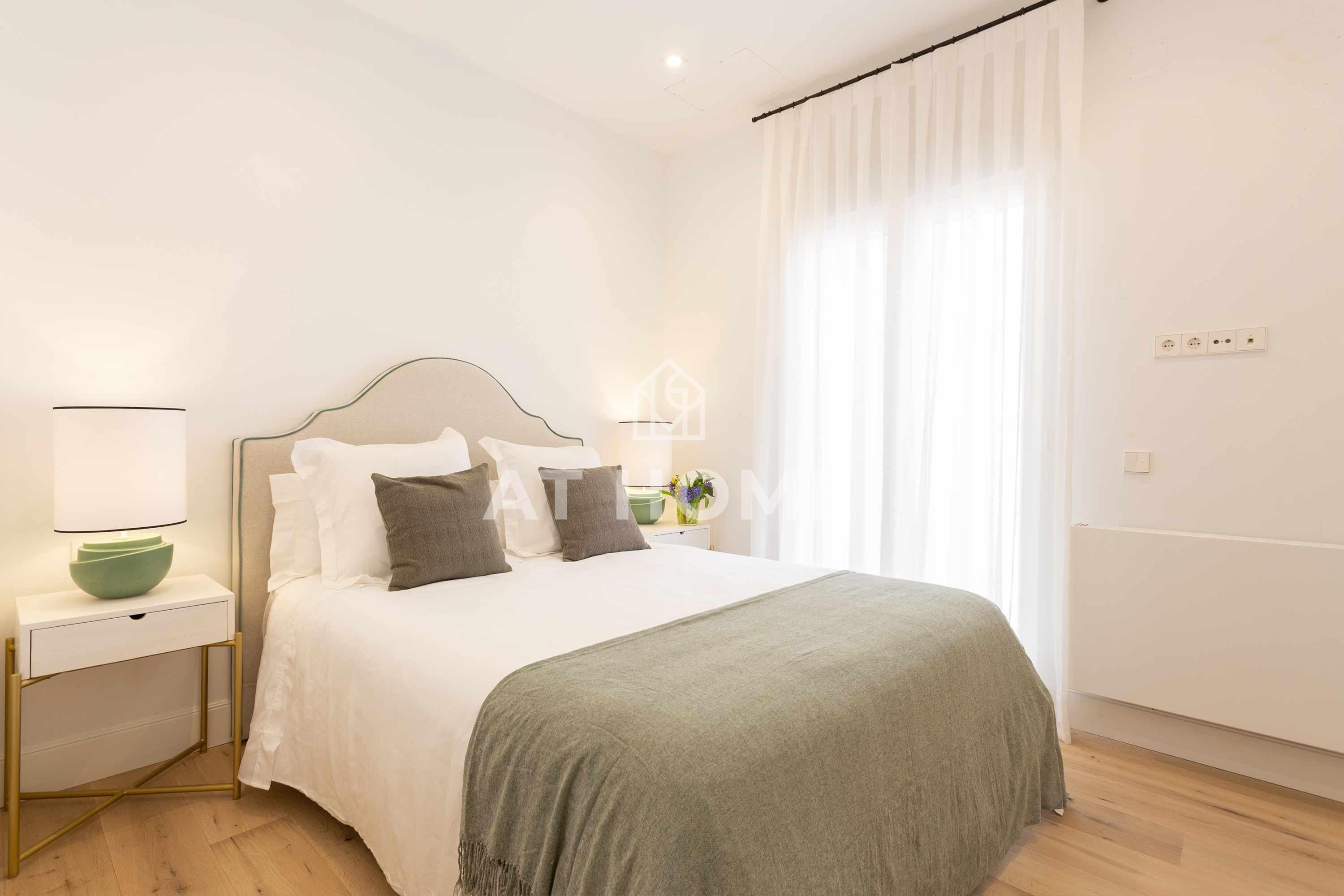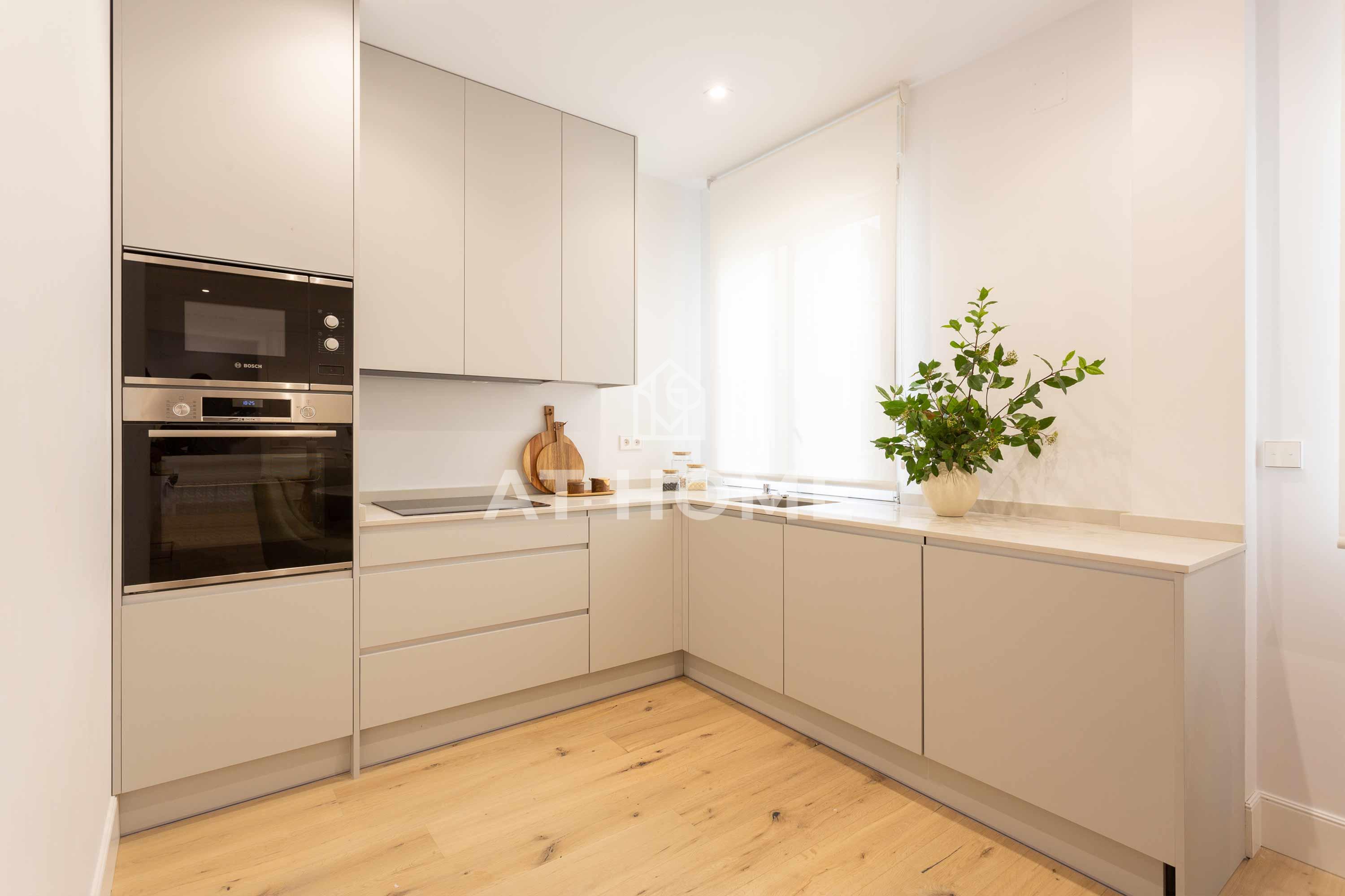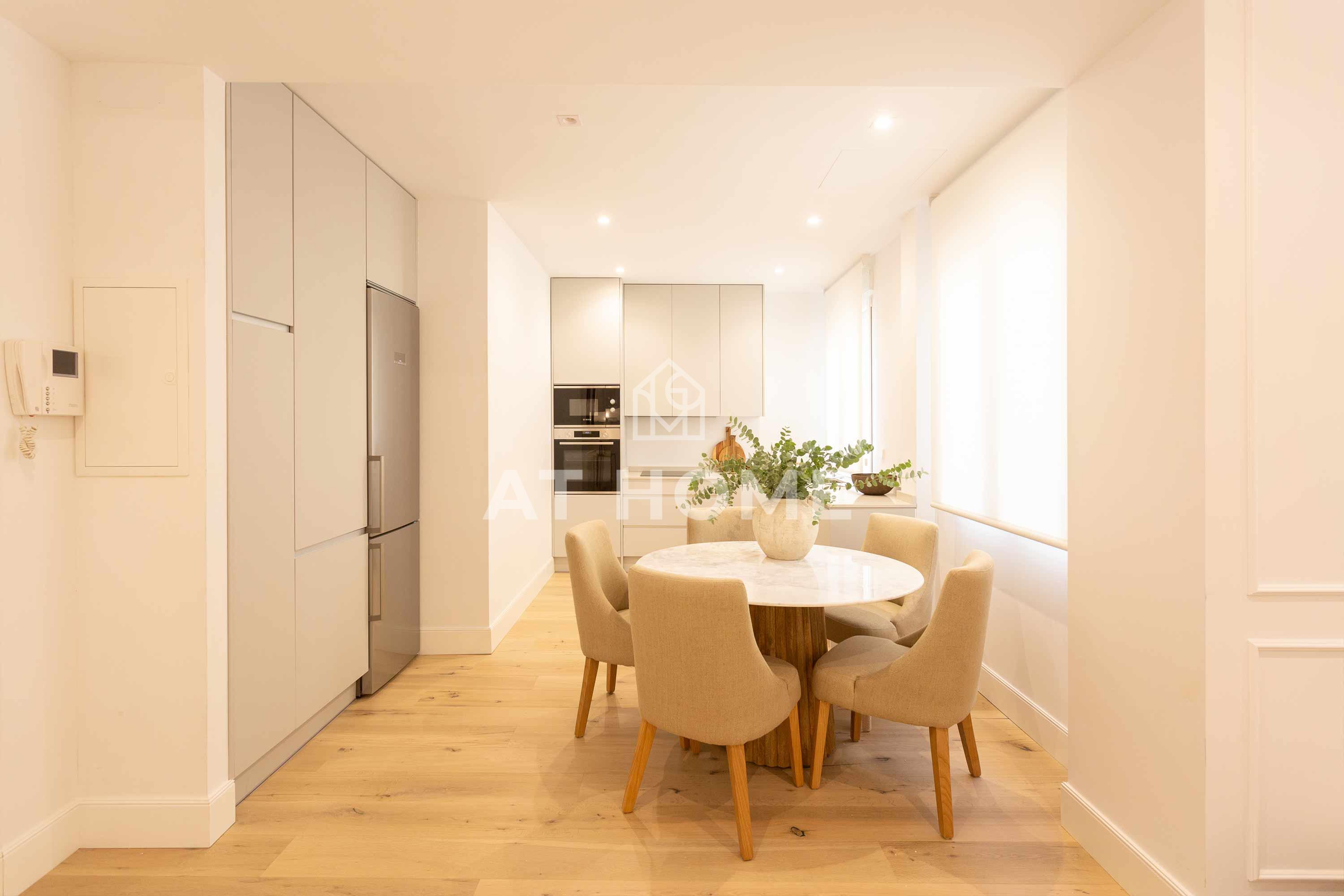 This elegant three-bedroom home has been refurbished, furnished and decorated brand new to offer you the best living experience. It has three en-suite bedrooms with natural morning light, which guarantees a quiet and relaxing atmosphere. The kitchen, integrated in the living room, has the best qualities of the market, including Silestone countertops and Bosch appliances.