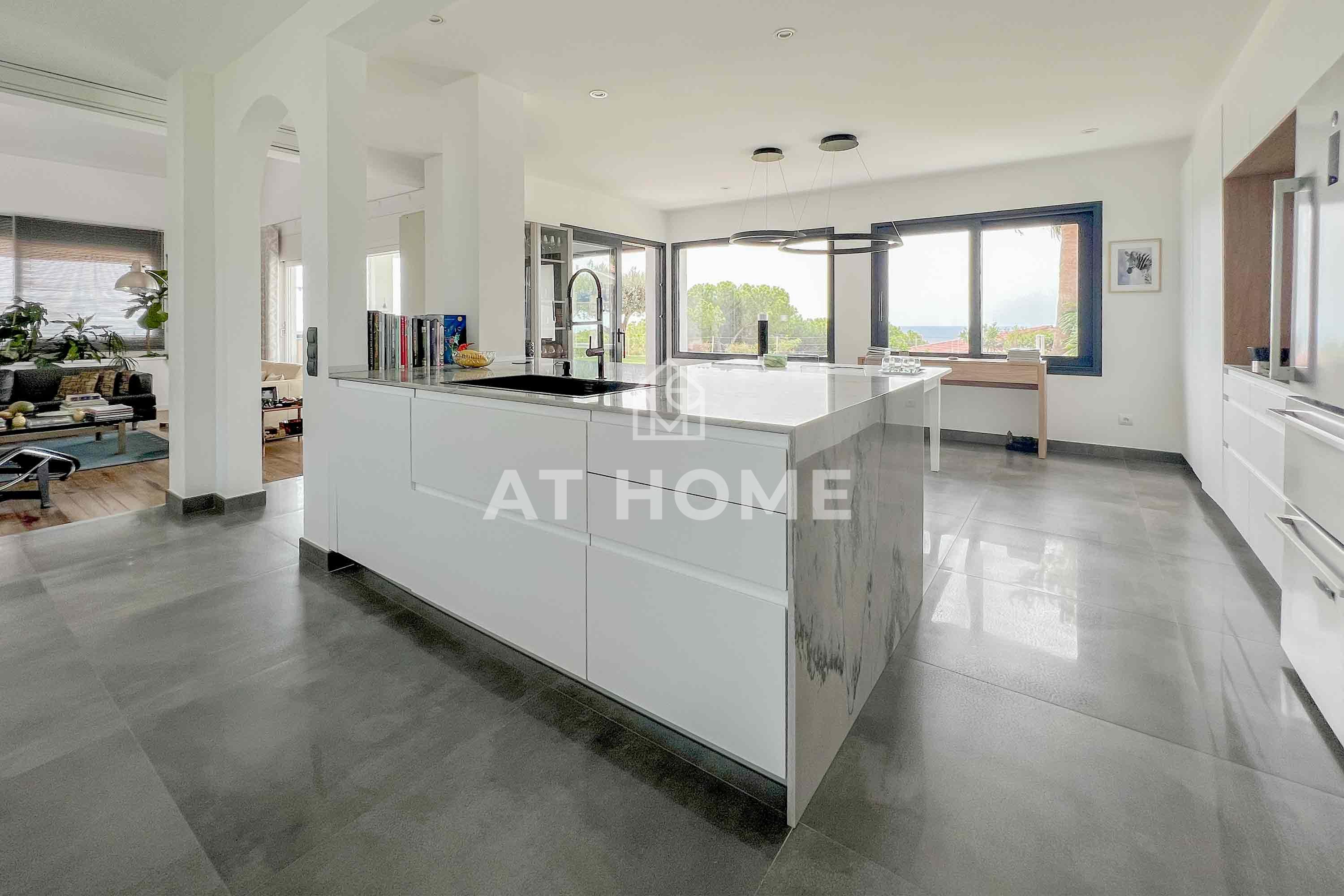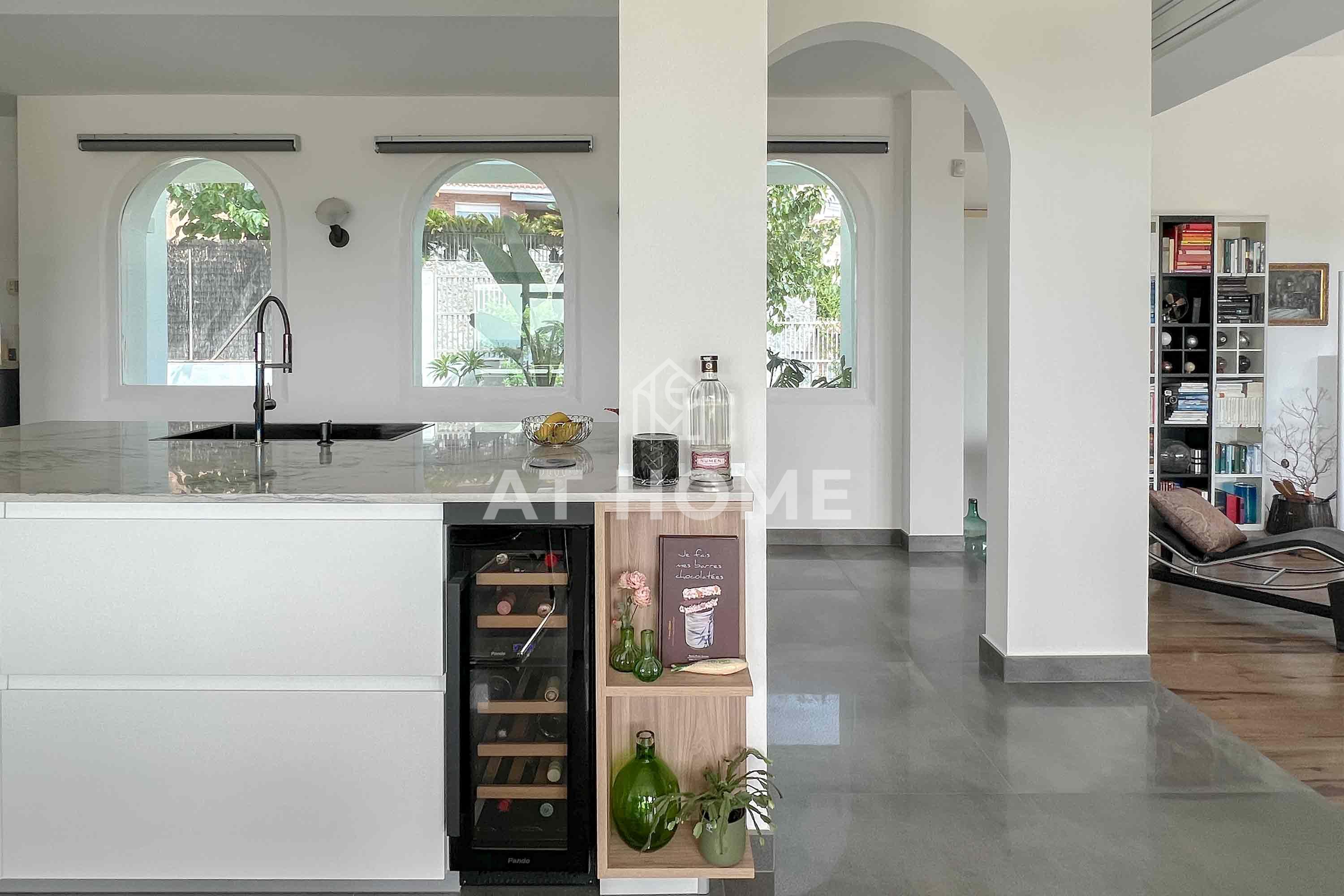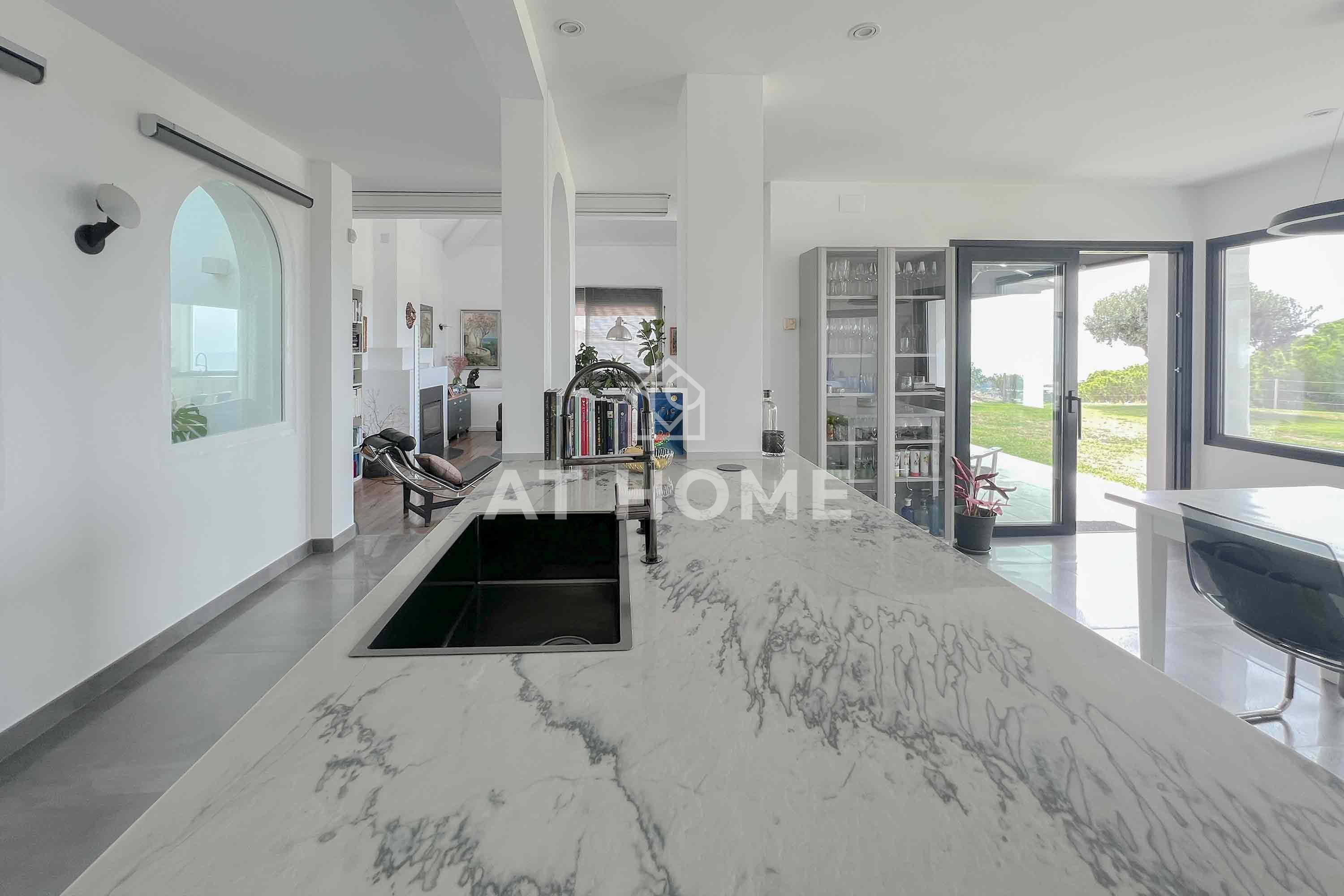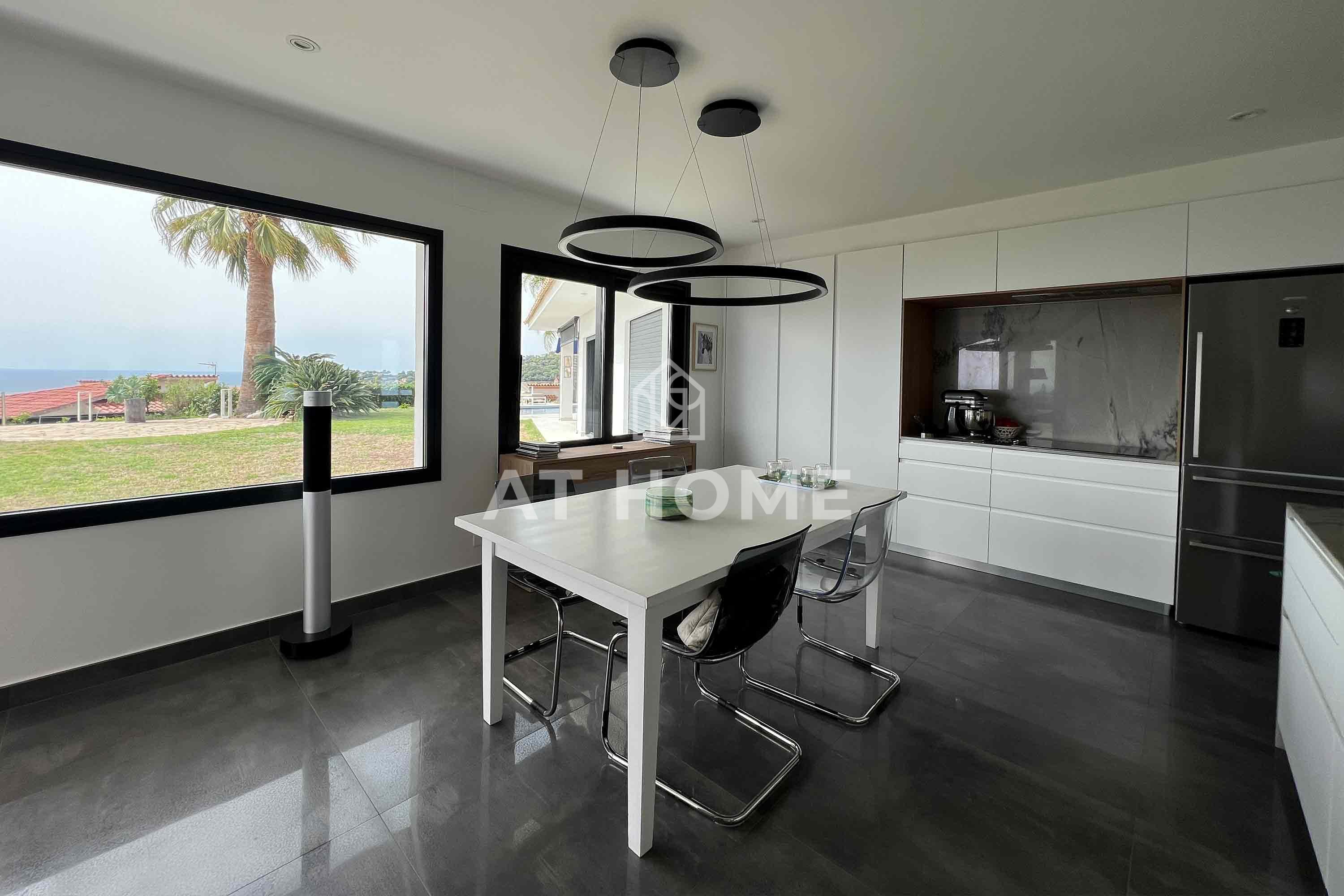 A la izquierda desde la misma encontramos una cocina completamente renovada, pensada al detalle y desde la que se disfruta de las vistas al jardín y al mar por sus grandes ventanales.
