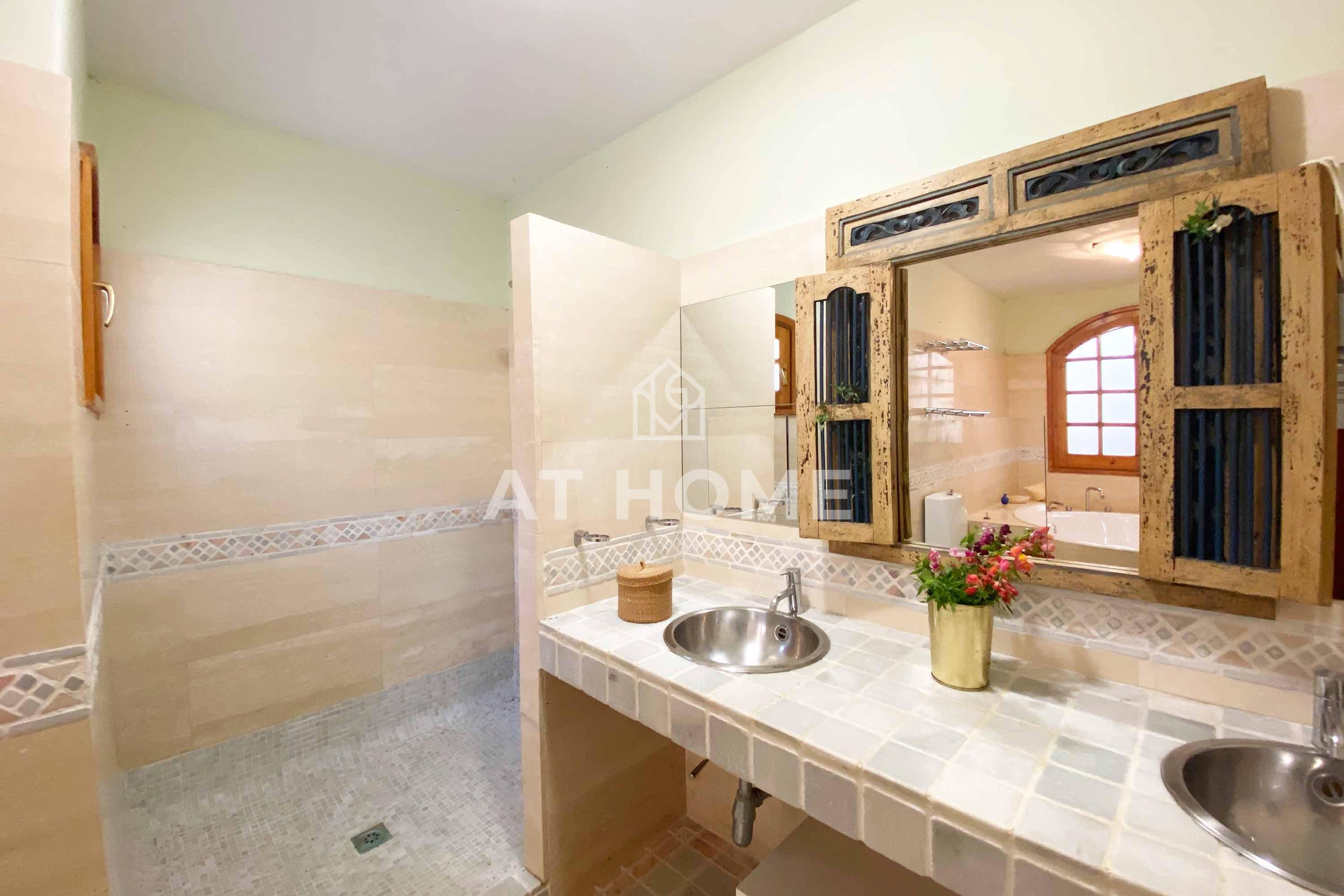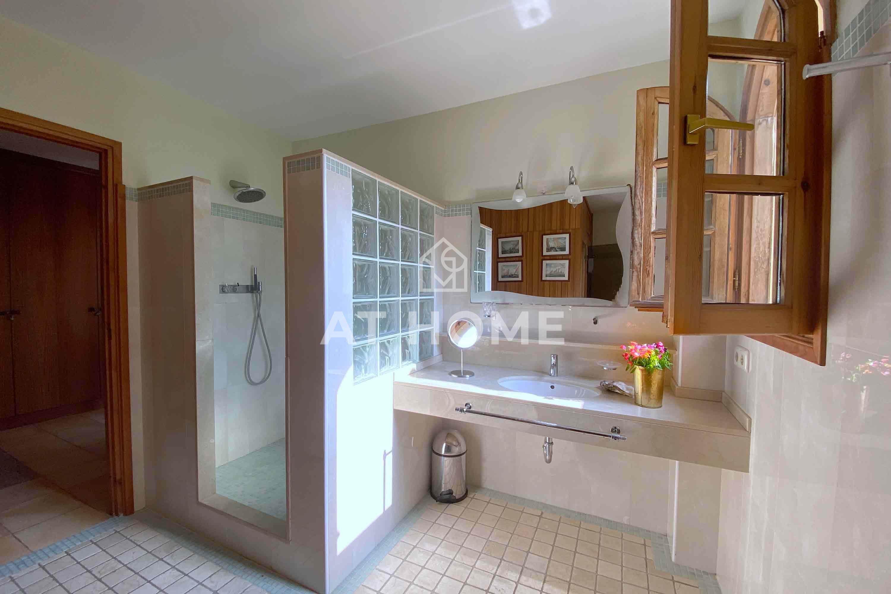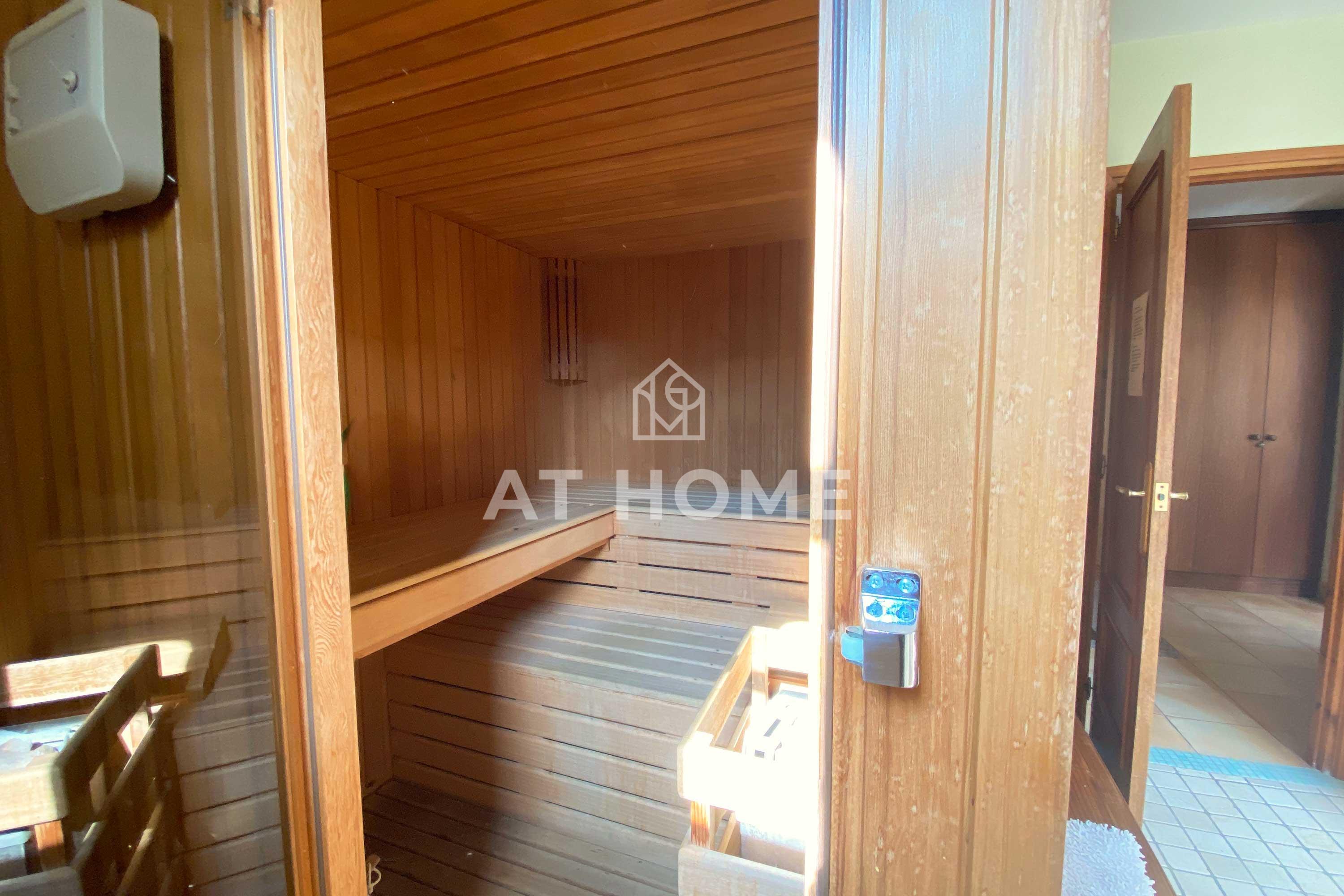 Un baño con sauna y gran ducha, desde aquí encontramos la salida al jardín y piscina.