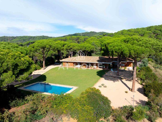 Elegante casa mediterránea en Sant Vicenç de Montalt. Cuenta con una sola planta, vistas a mar y rodeada de un gran jardín.