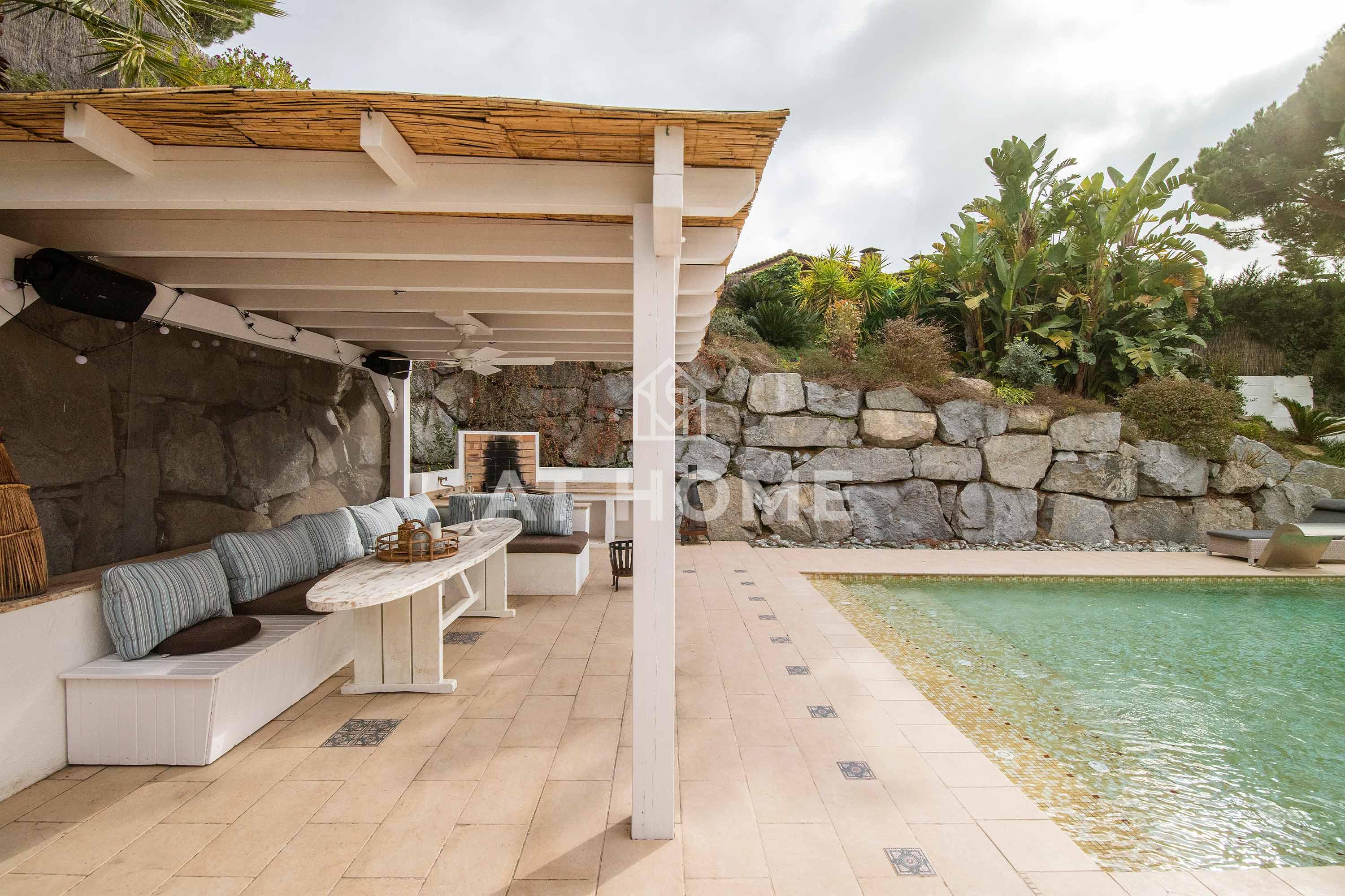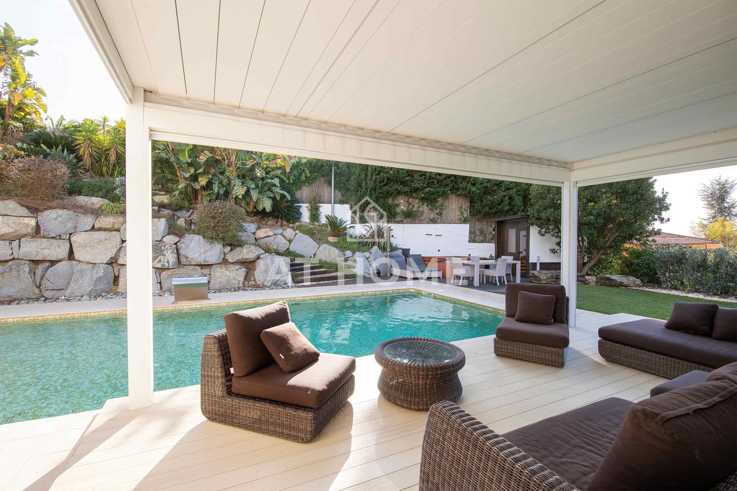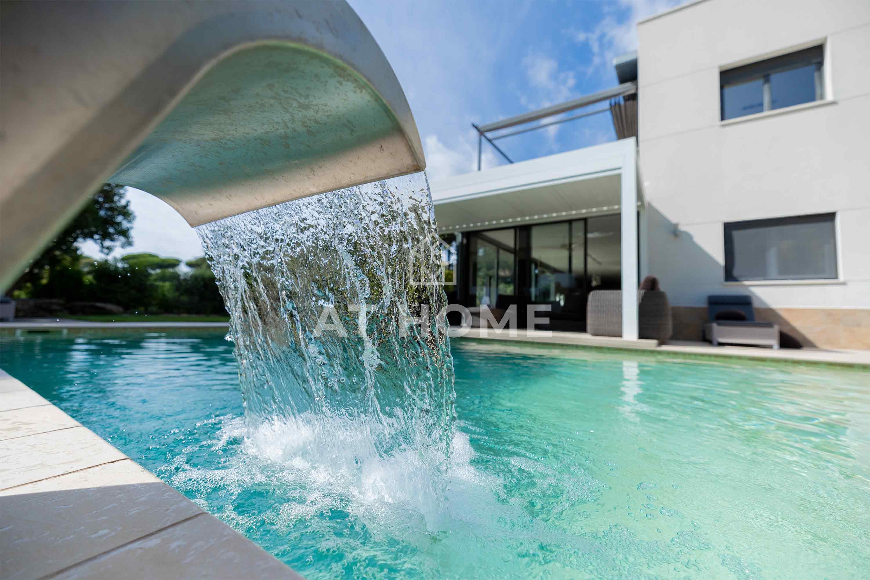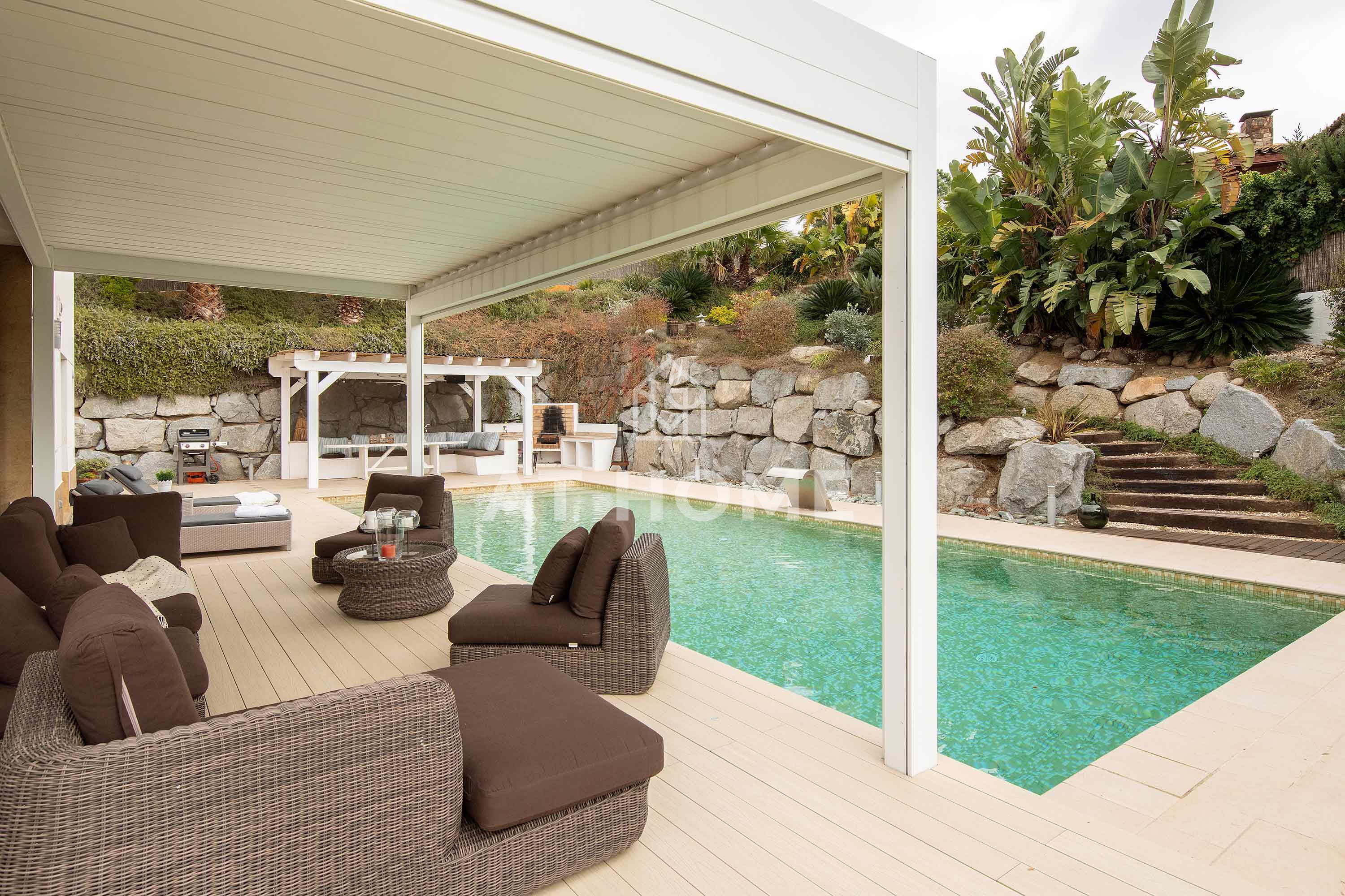 La gran piscina de hidrólisis salina está situada en un lateral de la propiedad, permitiendo el control visual de la zona desde la cocina y el comedor. La pérgola bioclimática articulada y con paredes desplegables de reciente construcción a la que se accede desde la sala se utiliza como salón exterior de verano. Otra gran pérgola de madera con cocina y barbacoa exterior está equipada con radiadores de infrarrojos y equipamiento musical, ideal para reuniones de amigos.