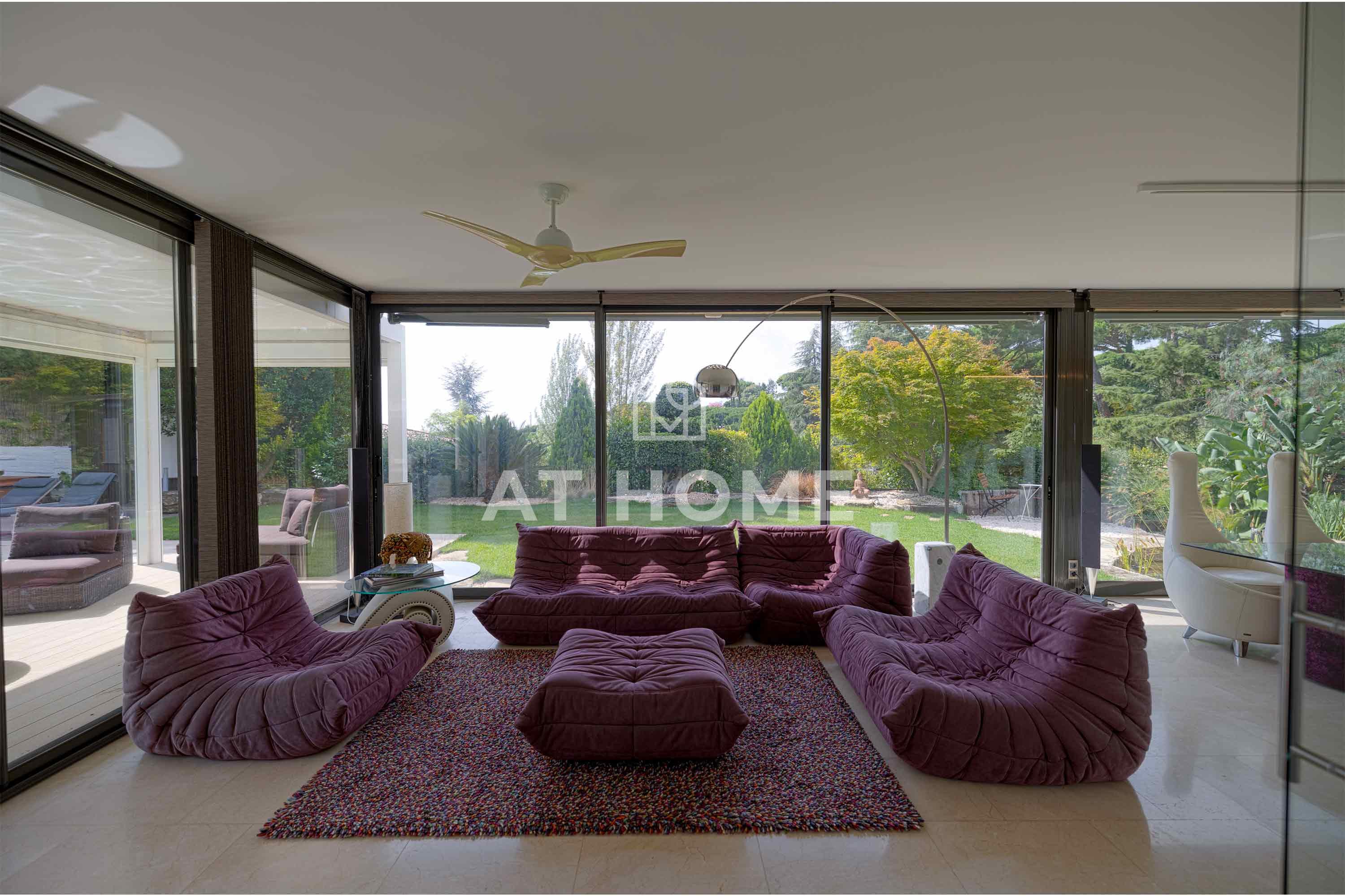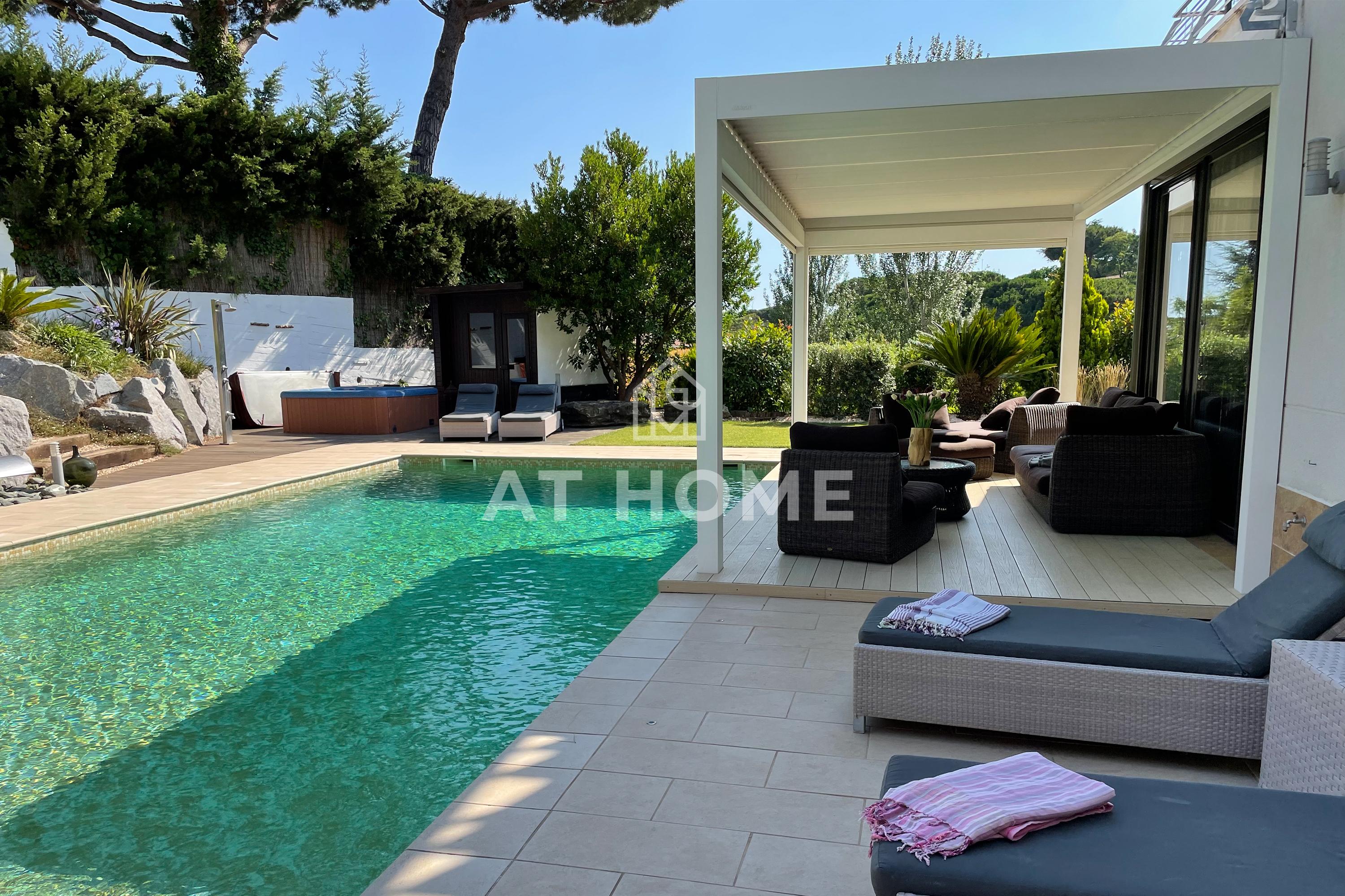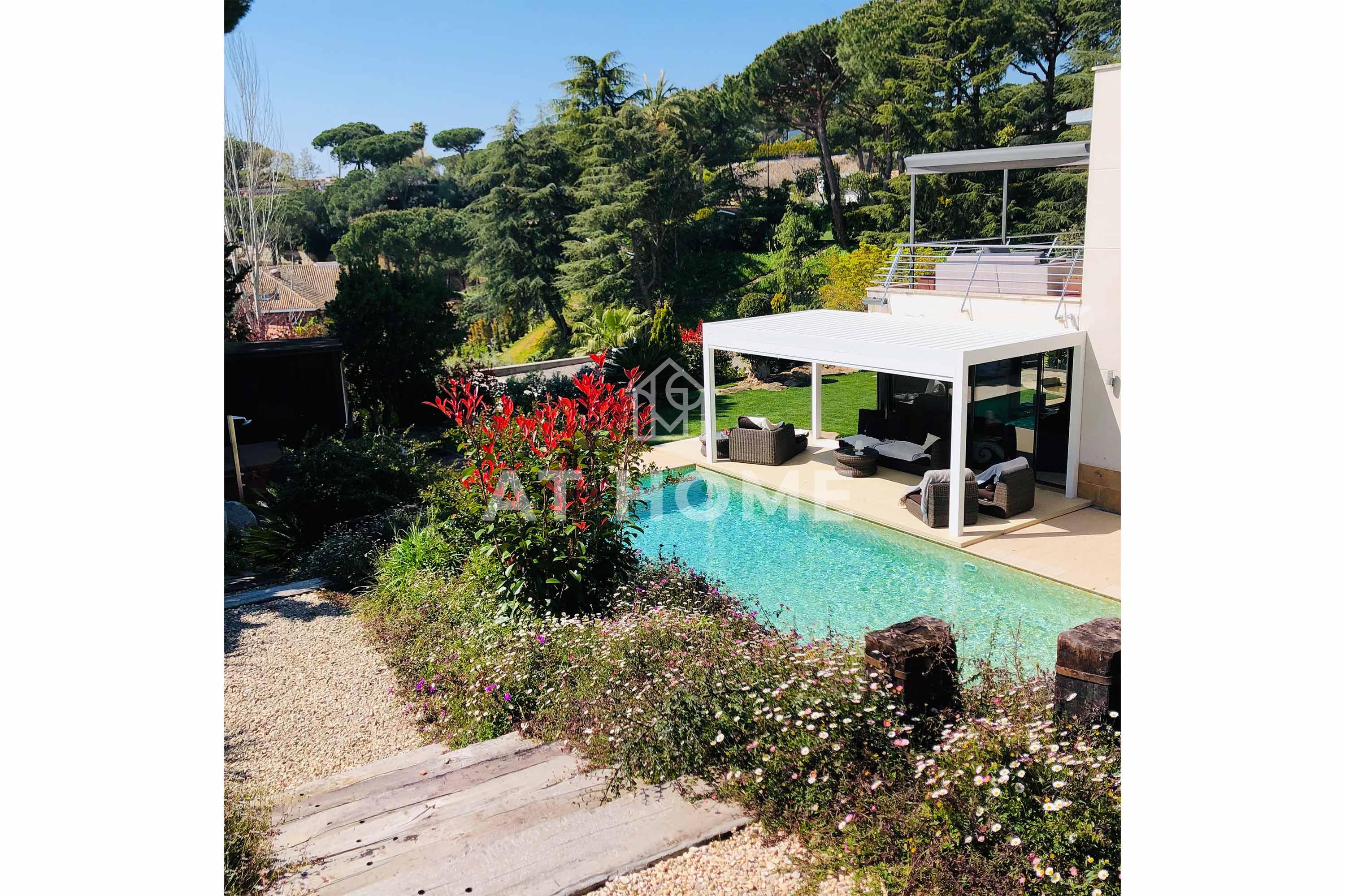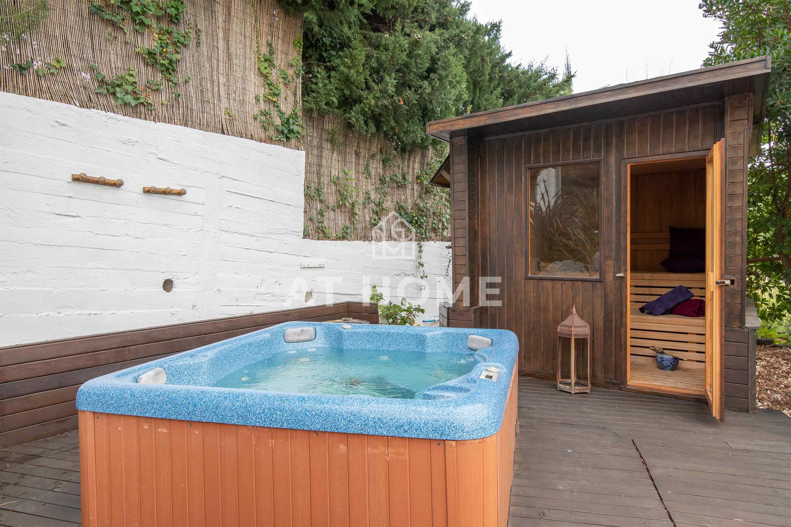 La gran piscina de hidrólisis salina está situada en un lateral de la propiedad, permitiendo el control visual de la zona desde la cocina y el comedor. La pérgola bioclimática articulada y con paredes desplegables de reciente construcción a la que se accede desde la sala se utiliza como salón exterior de verano. Otra gran pérgola de madera con cocina y barbacoa exterior está equipada con radiadores de infrarrojos y equipamiento musical, ideal para reuniones de amigos.