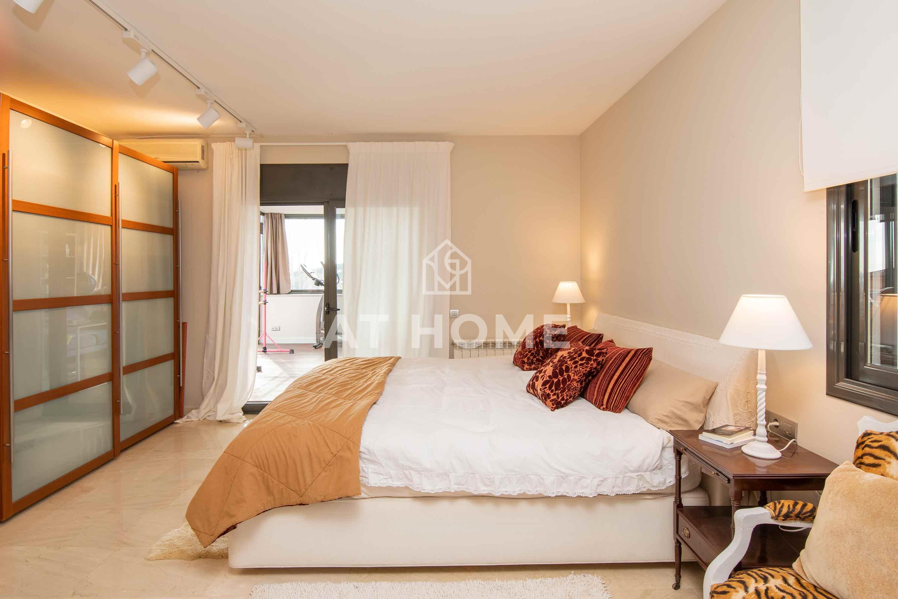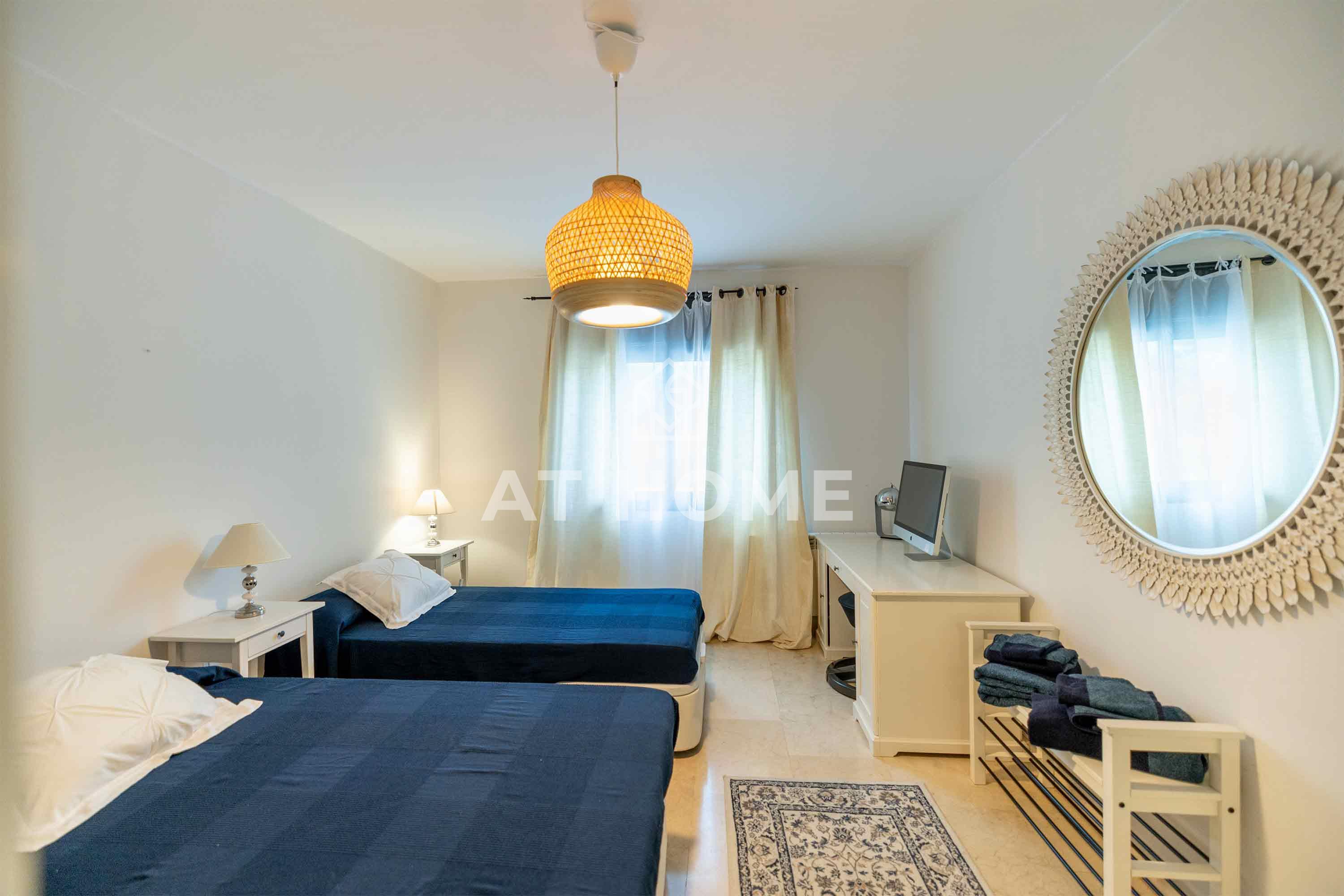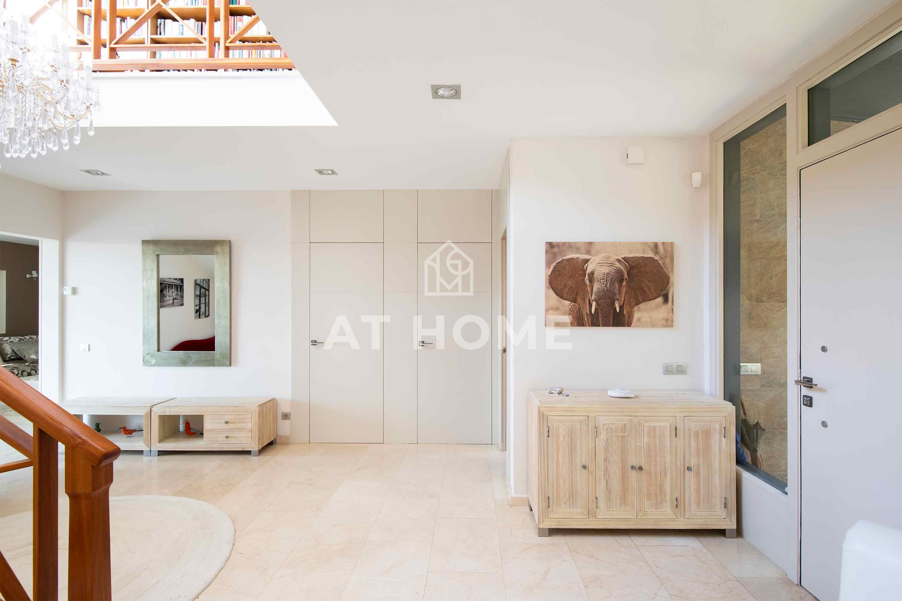 Una amplia escalera de mármol nos conduce a la planta superior, en la que una galería reparte el espacio en dos grandes estancias, una es un dormitorio con baño completo de diseño recién construido en suite y otra gran estancia con chimenea. A continuación del dormitorio se pasa a una sala/gimnasio con salida a la gran terraza superior a través de puertas correderas de cristal. Desde aquí disfrutamos de magníficas vistas al mar, pudiendo desplegar la pérgola para protegernos del sol.