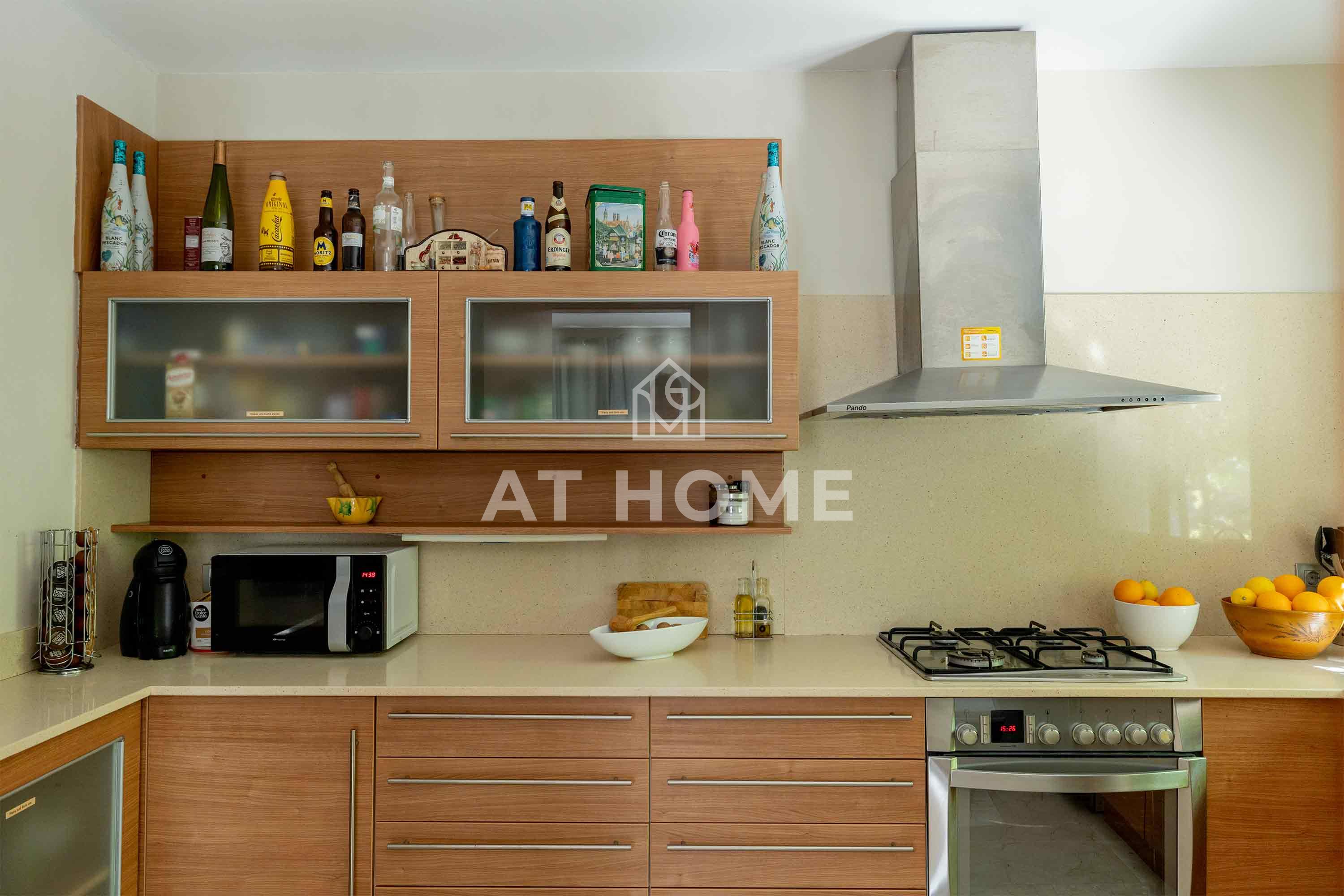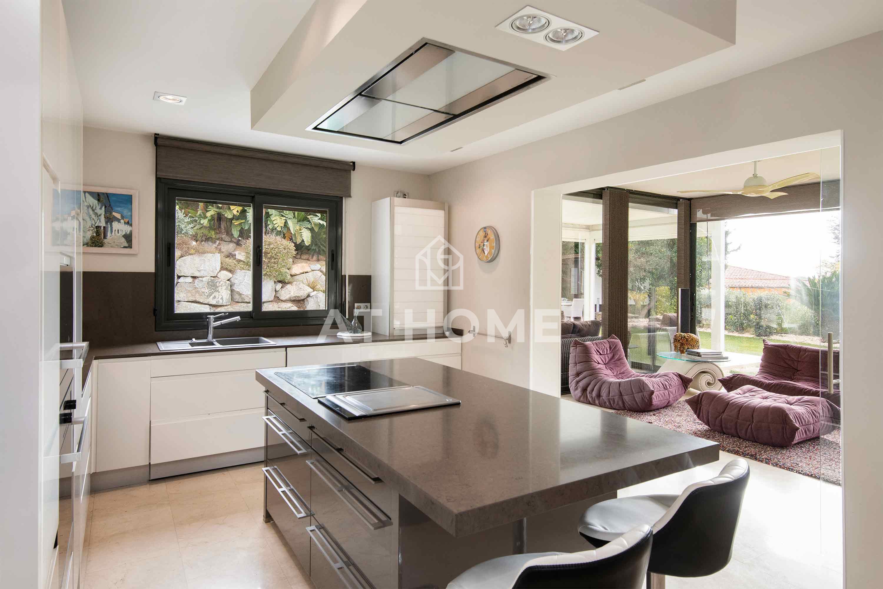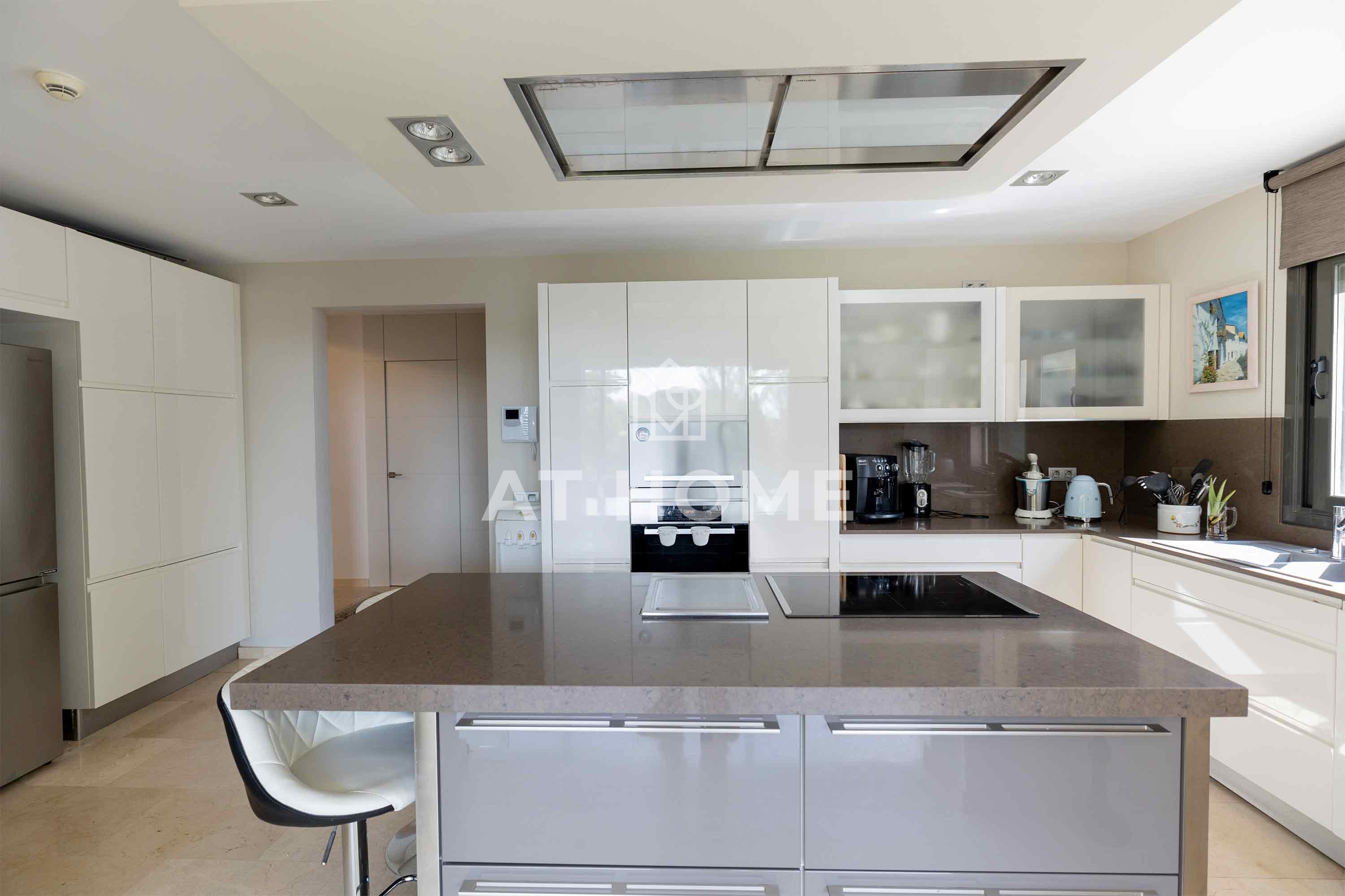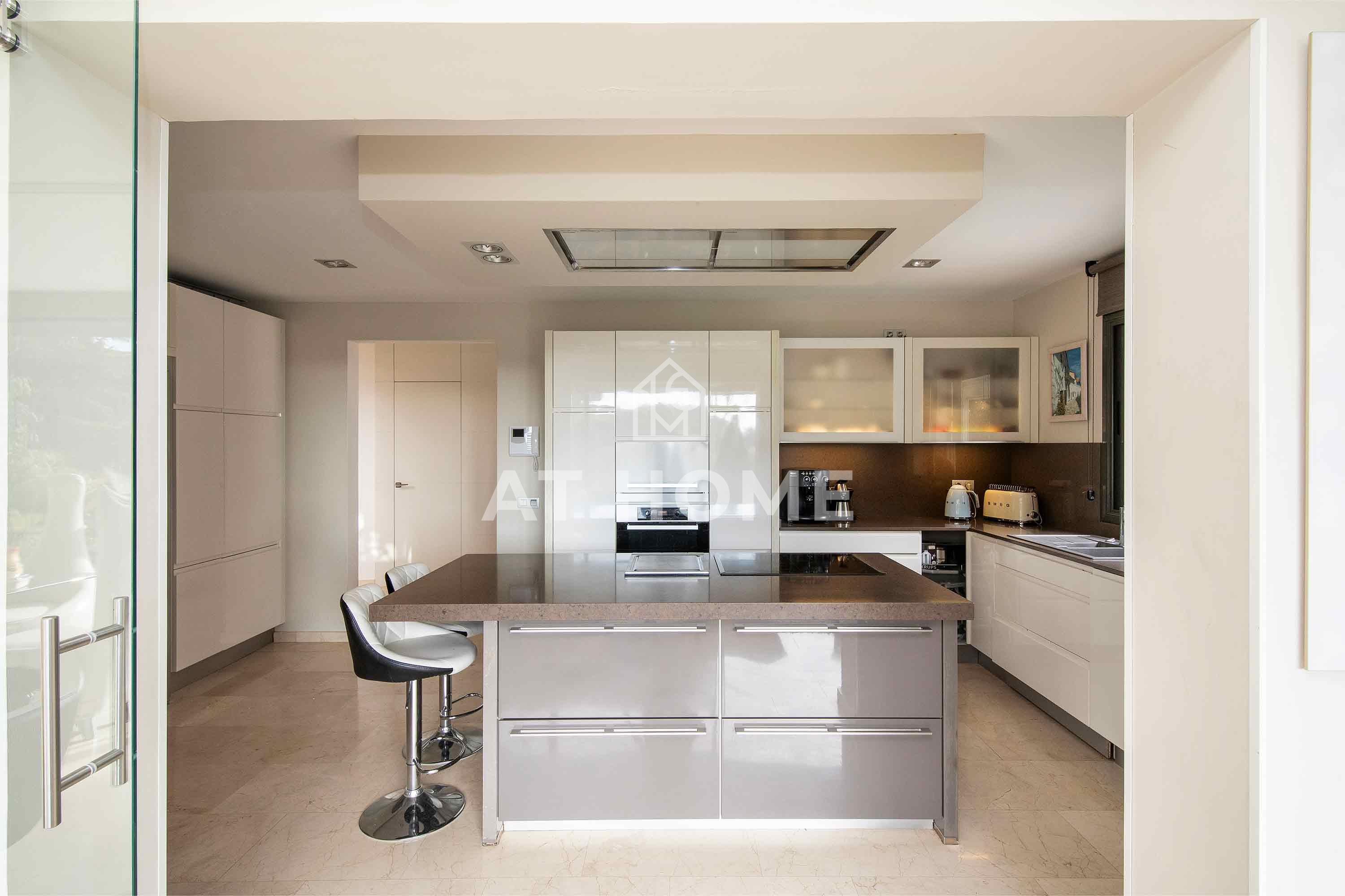 La cocina, de alta calidad, es de diseño italiano, tiene una isla central y generosos espacios para almacenaje. Está equipada con electrodomésticos de última tecnología alemana, extractor integrado en el techo, plancha teppanyaki y horno a vapor de presión. Tiene salida al salón-comedor a través de amplia puerta corredera de cristal.