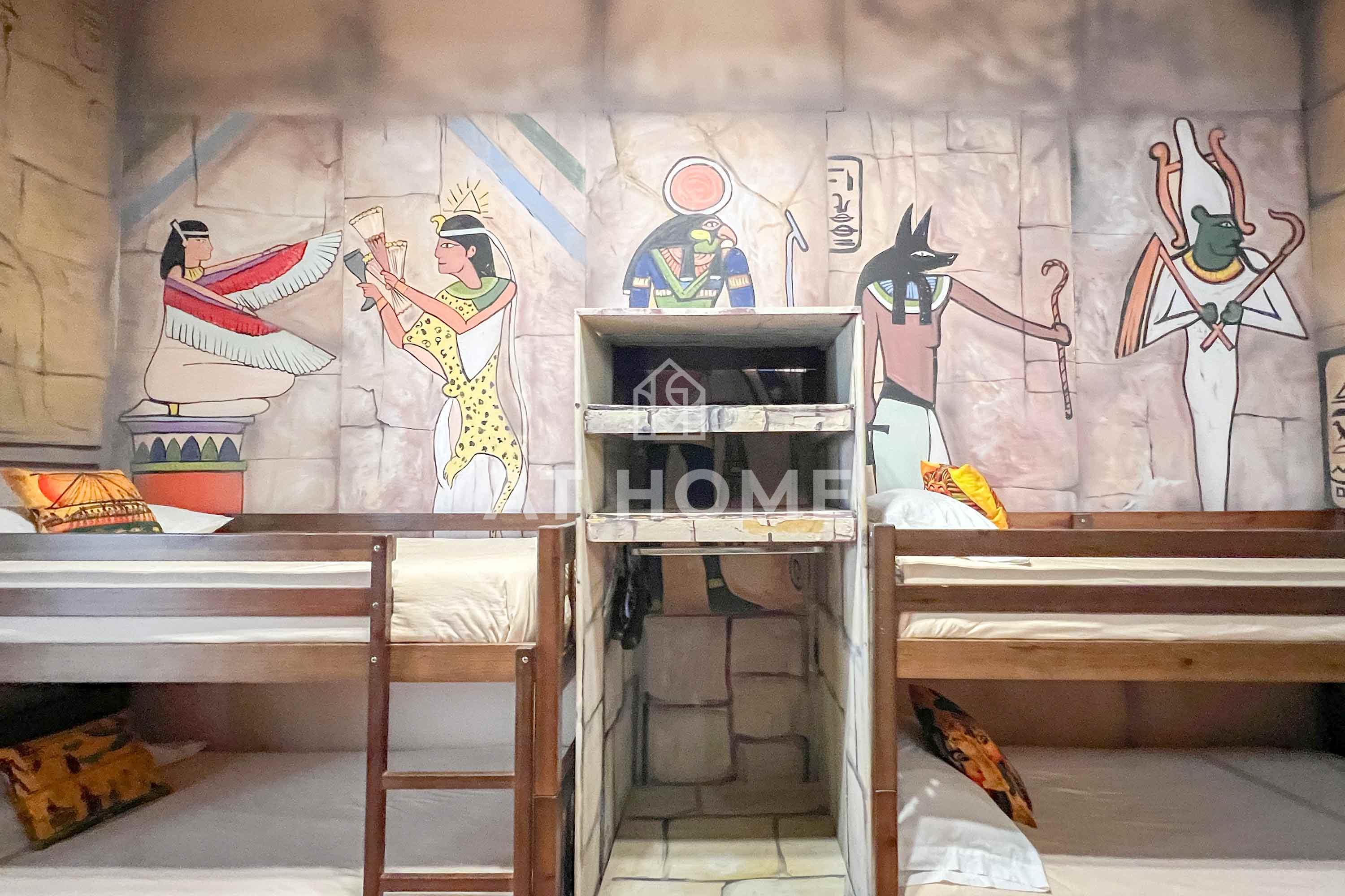 La villa cuenta con 5 habitaciones, 2 habitaciones distribuidas en dos plantas, tipo dúplex, y 1 habitación de temática egipcia.