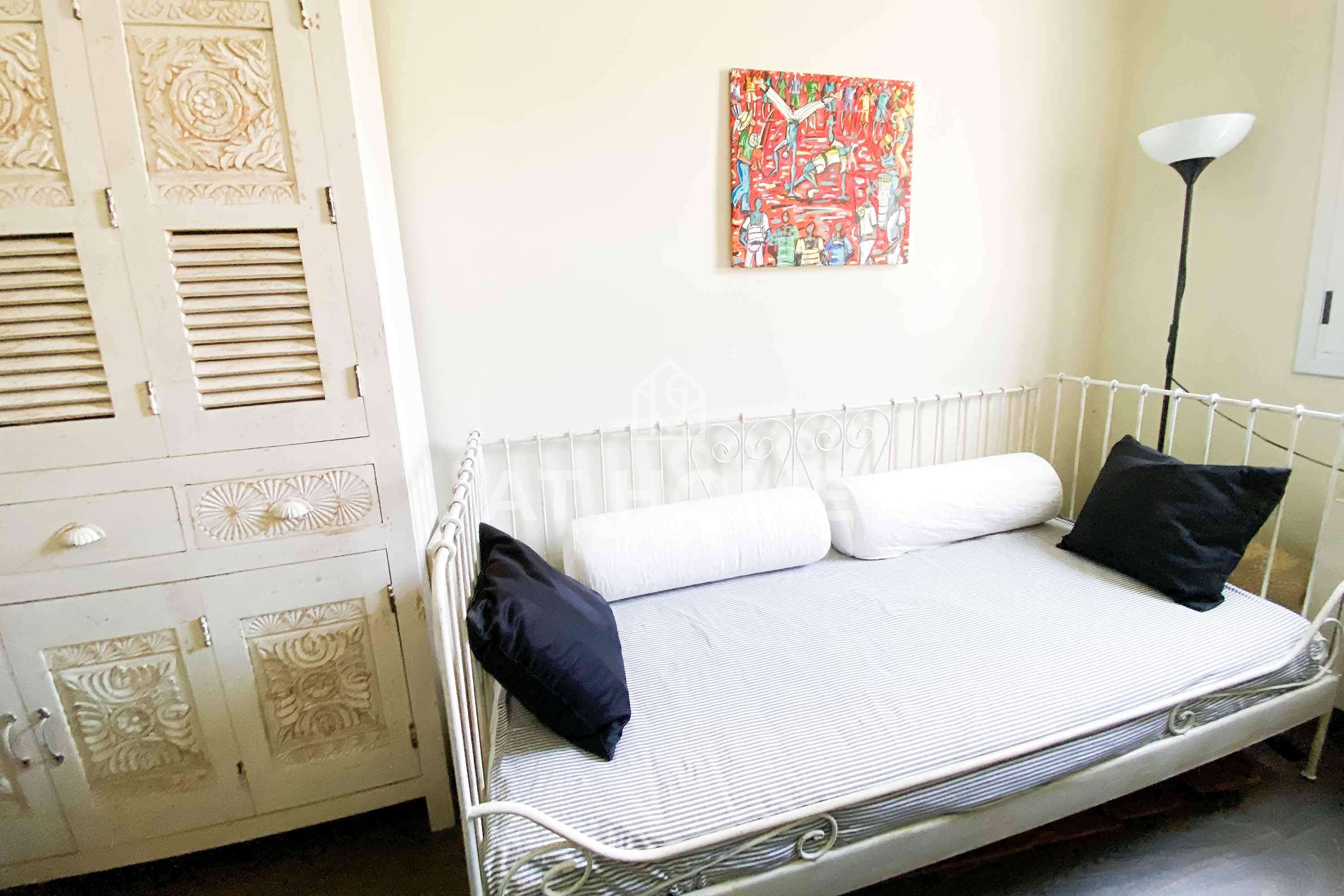 Una vez vista la planta baja, una escalera de madera nos conduce a la planta de habitaciones. Hay tres dormitorios: dos comparten un baño y otro es una gran suite . Todos tienen salida a terrazas y disponen de armarios empotrados . Son realmente espaciosos y luminosos. En esta planta hay aire acondicionado y ventiladores.